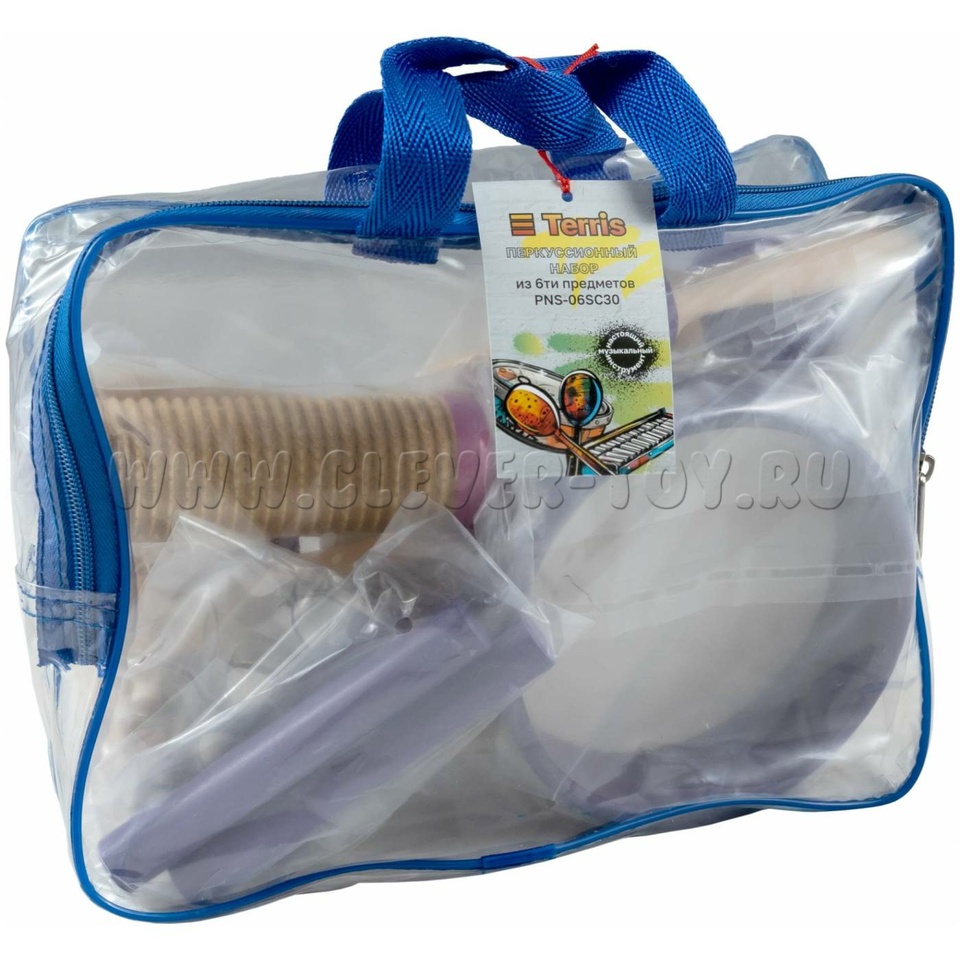 Перкуссионный набор TERRIS PNS-10BP состоит из 10-ти предметов, оформленных в красочном стиле: разноцветного металлофона с палочкой, тамбурина, пары маракас, пары пластиковых кастаньет, две пары шейкеров в форме "яиц", металлического треугольника с палочкой и 3 джингл-стика.
