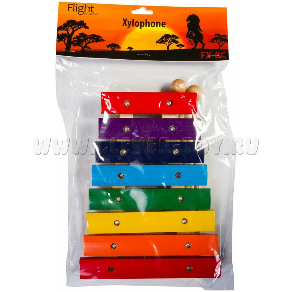 Ксилофон FLIGHT FX-8 C имеет 8 разноцветных деревянных брусочков, соответствующих нотам, и 2 палочки.