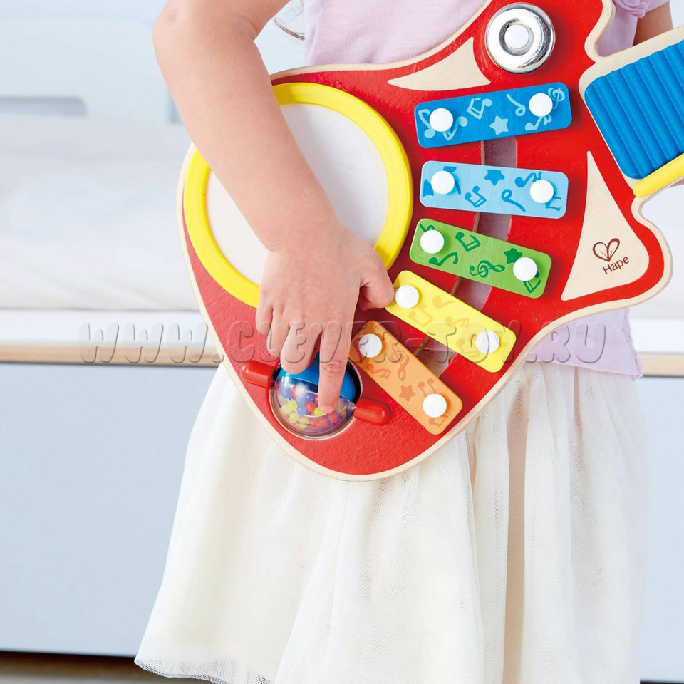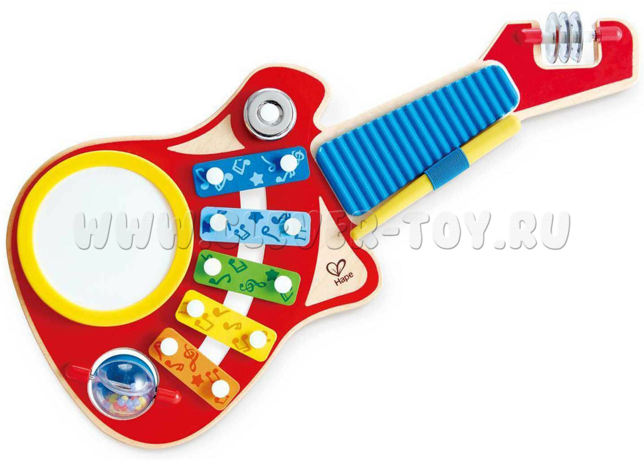 6 инструментов в одном: бубен, ксилофон, барабан, трещетка, сфера с шариками, металлические тарелочки.