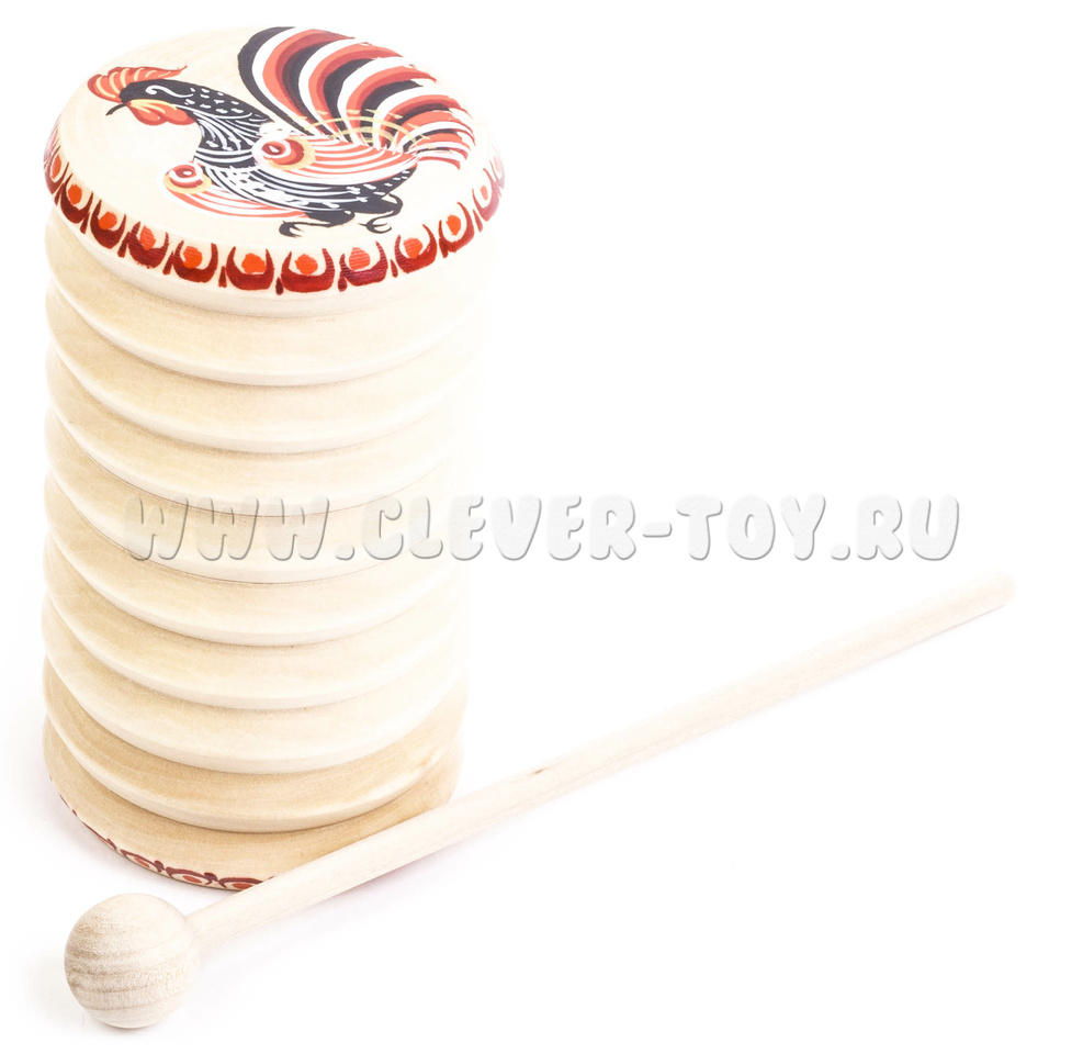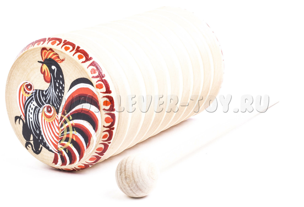 Погремушка представляет собой полый деревянный цилиндр диаметром 65 мм и высотой 120 мм. Внутрь стакана засыпана охотничья дробь. Сверху стакан наглухо закрыт деревянной крышкой. С наружной стороны ребристый. Канавки под углом 90 градусов выполнены токарным способом. Музыкальный инструмент комплектуется ударной палочкой с шариком на конце. Материал: липа.