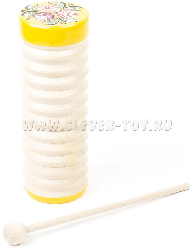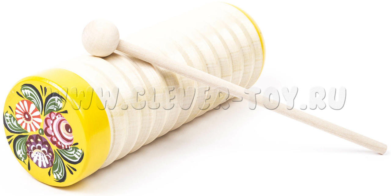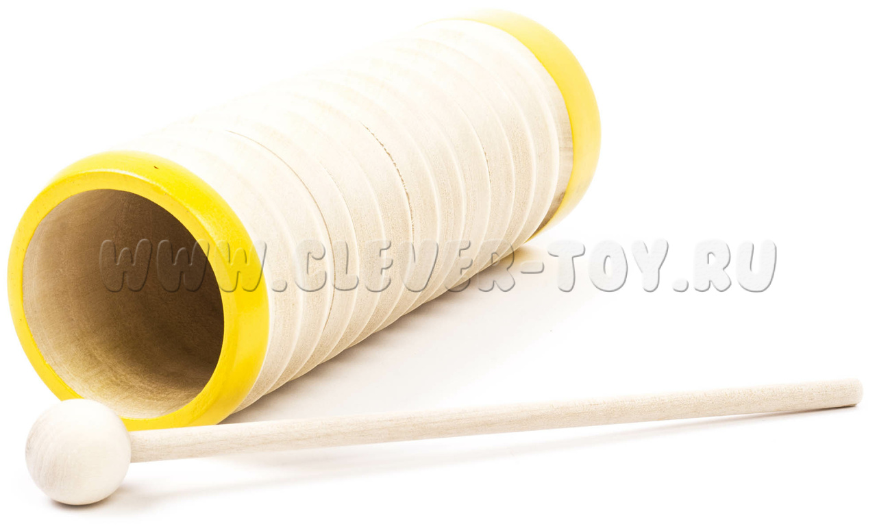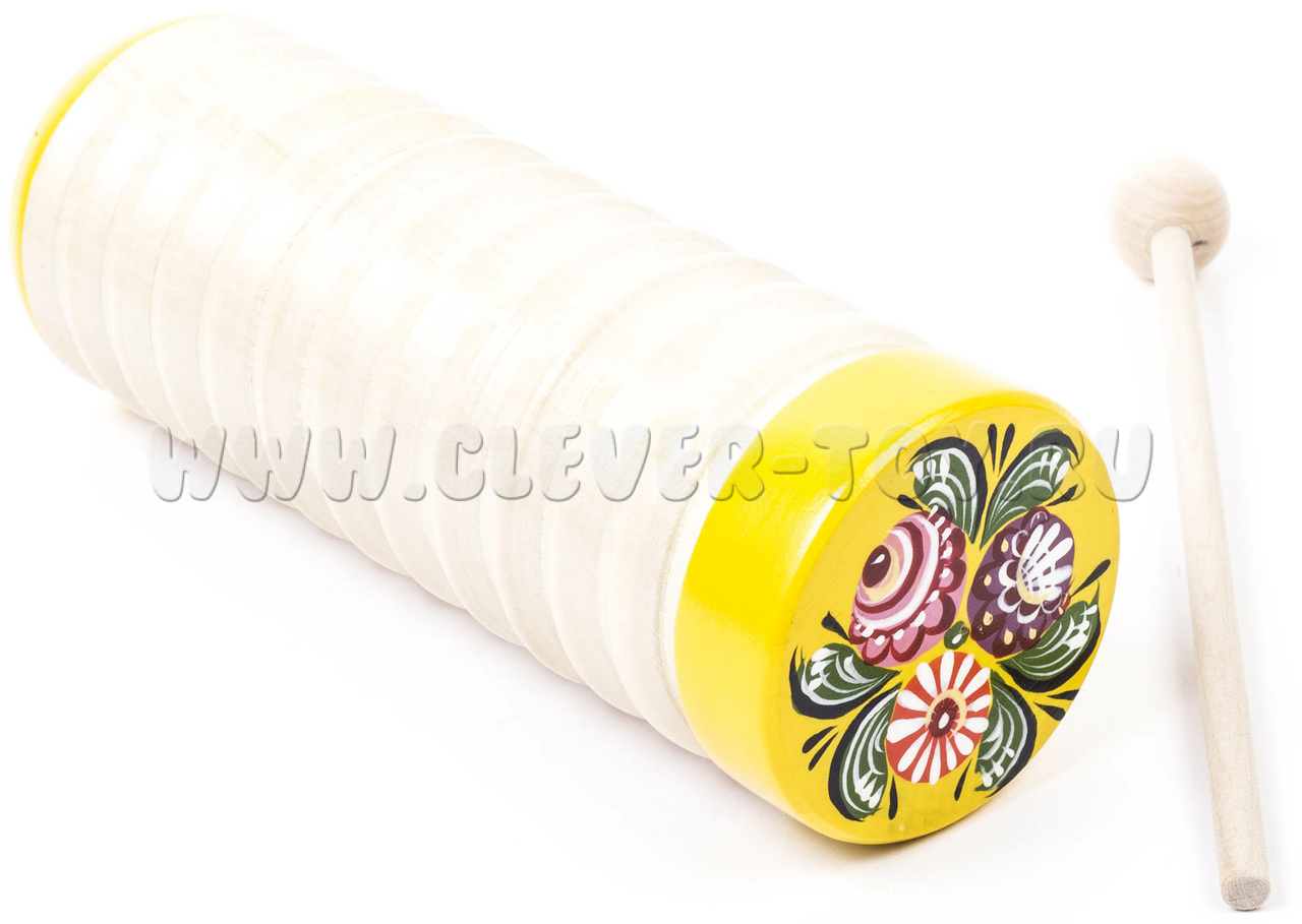 Рубель представляет собой полый деревянный цилиндр. С внутренней стороны гладкий, снаружи - ребристый. Канавки под углом 90 градусов выполнены токарным способом. С одной стороны цилиндр закрыт деревянной бобышкой длиной 35 мм. Музыкальный инструмент комплектуется ударной палочкой с шариком на конце. Размеры: длина 165 мм, диаметр 55 мм.