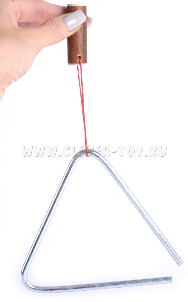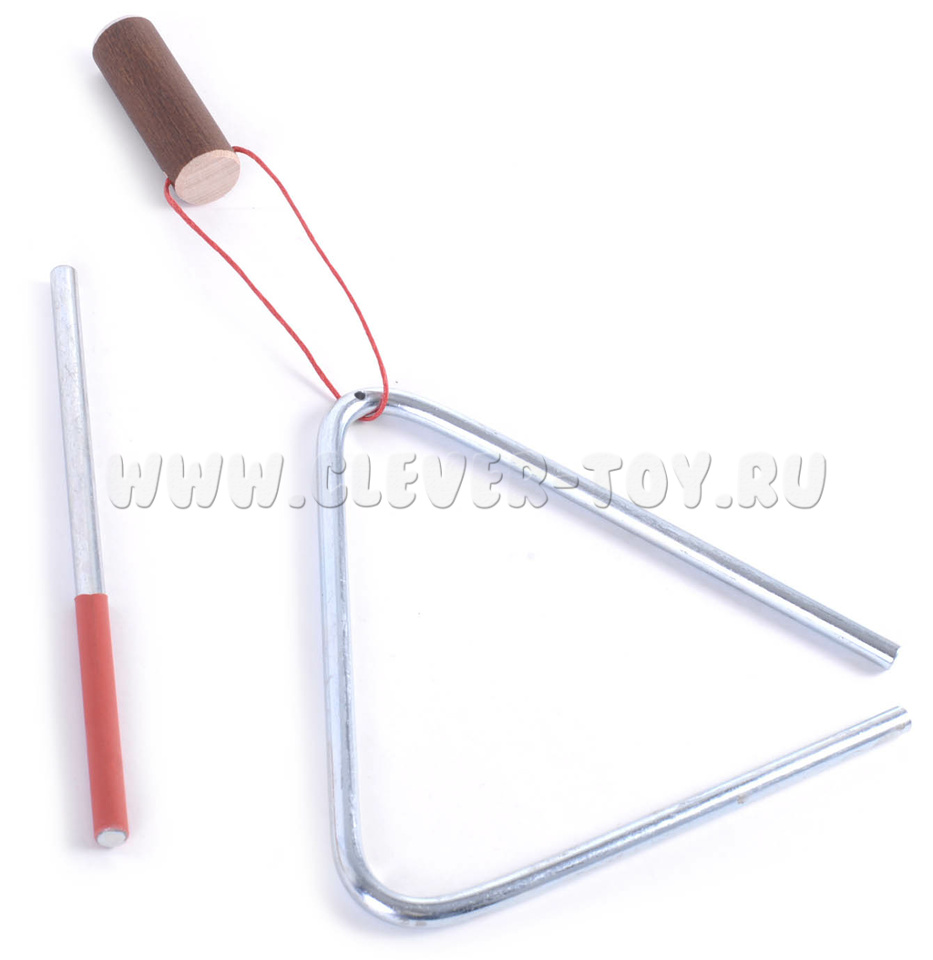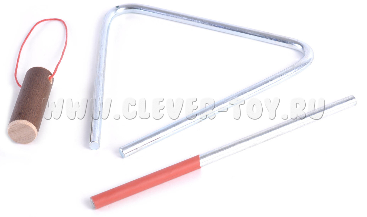 Треугольник выполнен из стали диаметром 6мм, длина стороны - 13см. Гальваническое покрытие не ухудшает качество звука и не разрушается при механическом воздействии. Ударная палочка из нержавеющей стали.