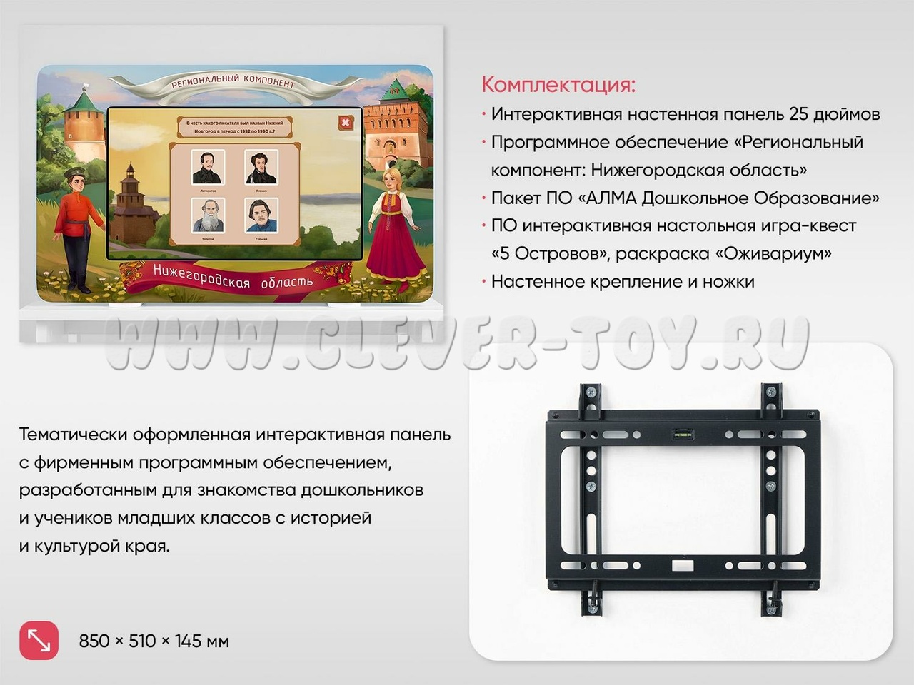- Интерактивная настенная панель 25 дюймов (Full HD, мультитач 10 касаний, характеристики встроенного компьютера уточняйте у менеджера)