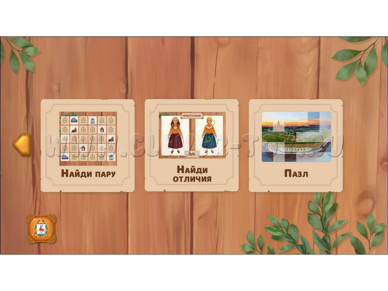Программное обеспечение включает интерактивную карту нижегородской области, викторину, пазлы, игры "Найди пару" и "Найди отличия".