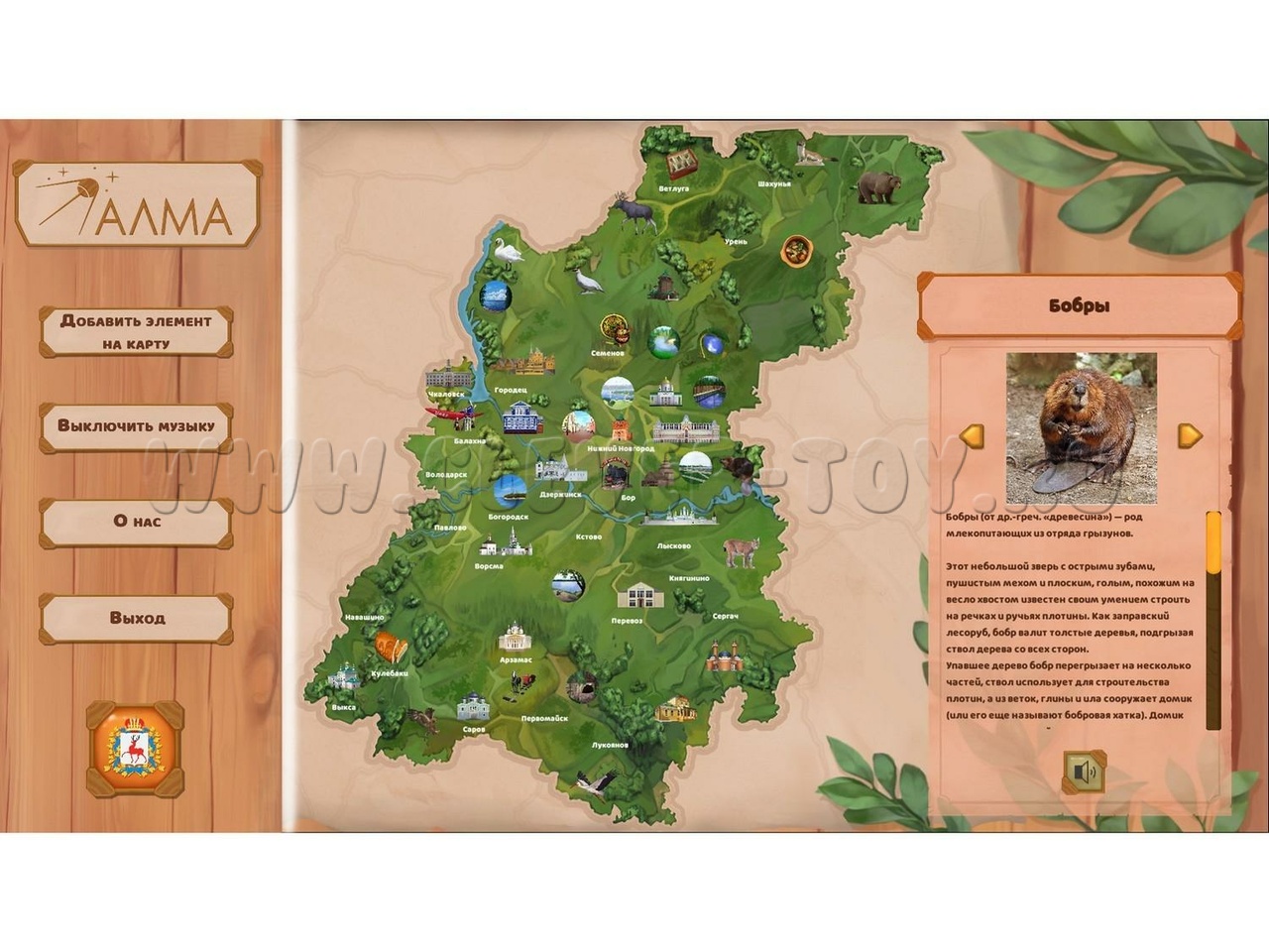Программное обеспечение включает интерактивную карту нижегородской области, викторину, пазлы, игры "Найди пару" и "Найди отличия".