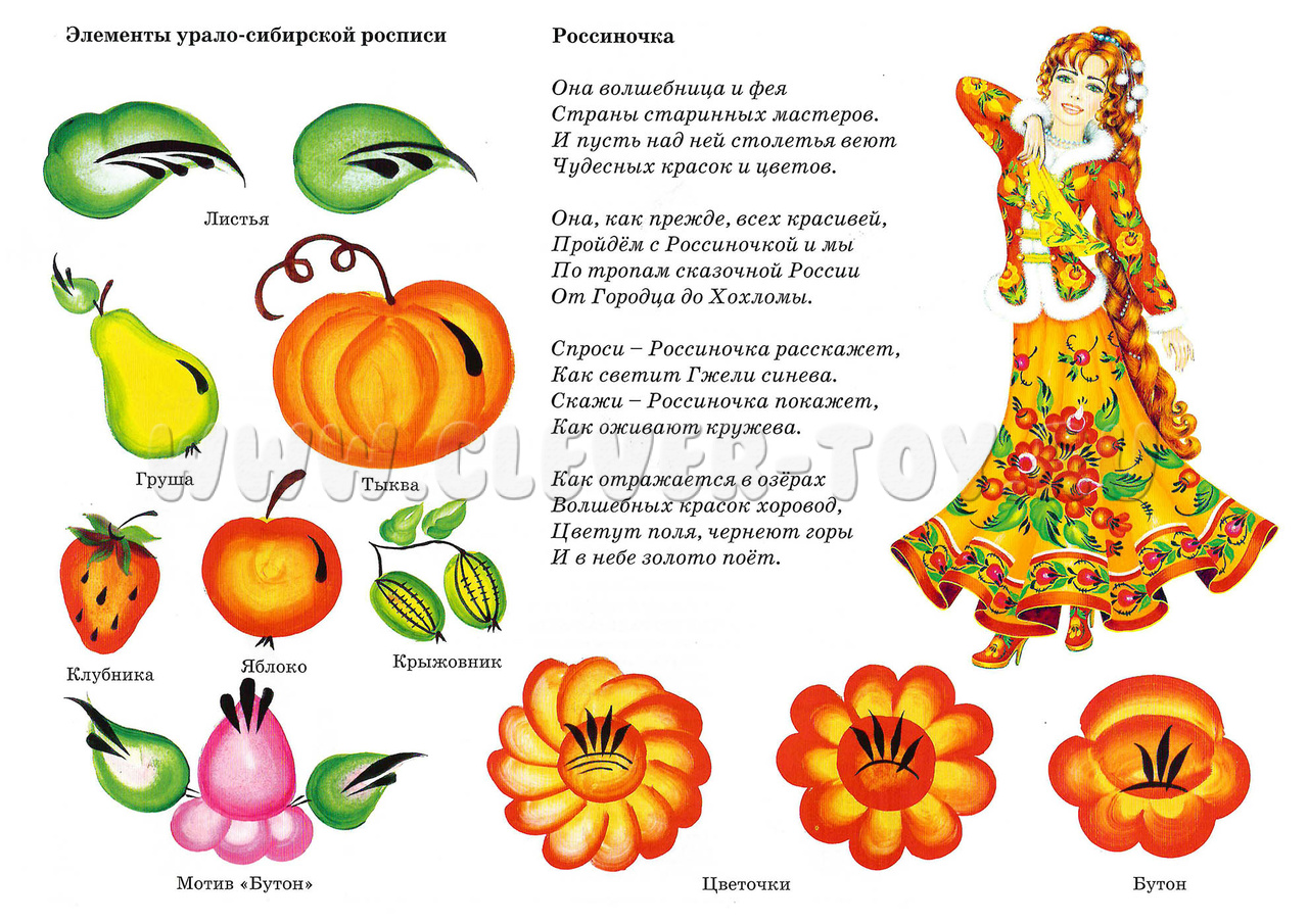 - Элементы урало-сибирской росписи (листья, груша, тыква, клубника, яблоко, крыжовник, мотив "Бутон", цветочки, бутон).