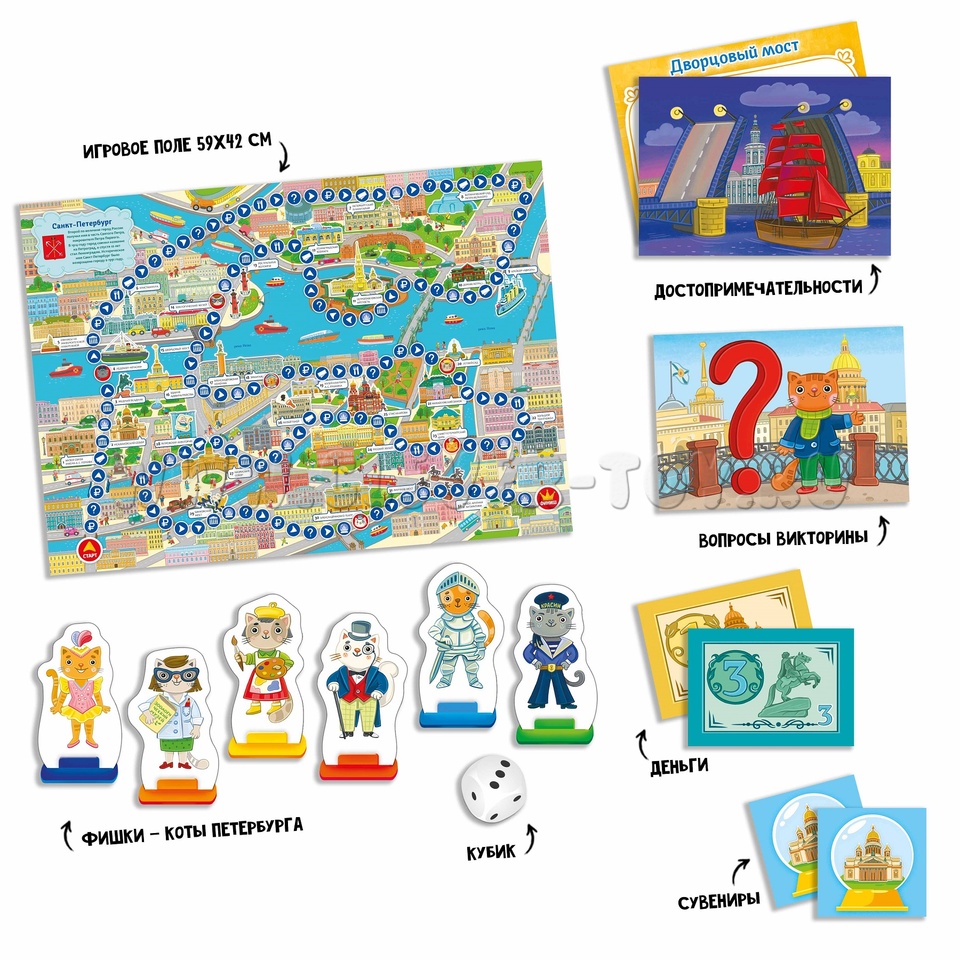 - Игровое поле 59х42 см. На поле в виде карты Санкт-Петербурга нанесены изображения и названия достопримечательностей города, символы-обозначения (Возьми 1 рубль из банка, Заплати 1 рубль и возьми сувенир, Посети достопримечательность, Зайди перекусить в кафе, Ответь на вопрос викторины)