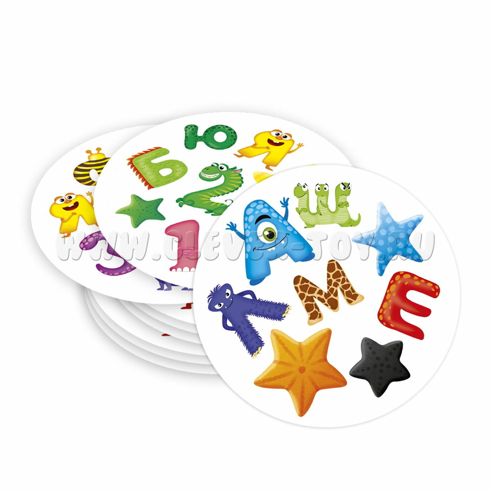 В состав игры входит 57 круглых карточек. На каждой карточке вперемешку изображены 8 символов – буквы и цифры в виде забавных сказочных животных. Карточки выполнены из плотного картона. Рисунки яркие, крупные, привлекающие внимание детей.
