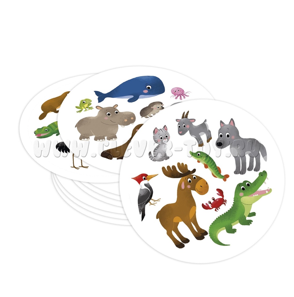 В состав игры входит 57 круглых карточек. На каждой карточке вперемешку изображены 8 фигур забавных животных, птиц и рыб. Например: котёнок, козлик, крокодил, волк, щука, краб, лось, дятел. Карточки выполнены из плотного картона. Рисунки яркие, крупные, привлекающие внимание детей.