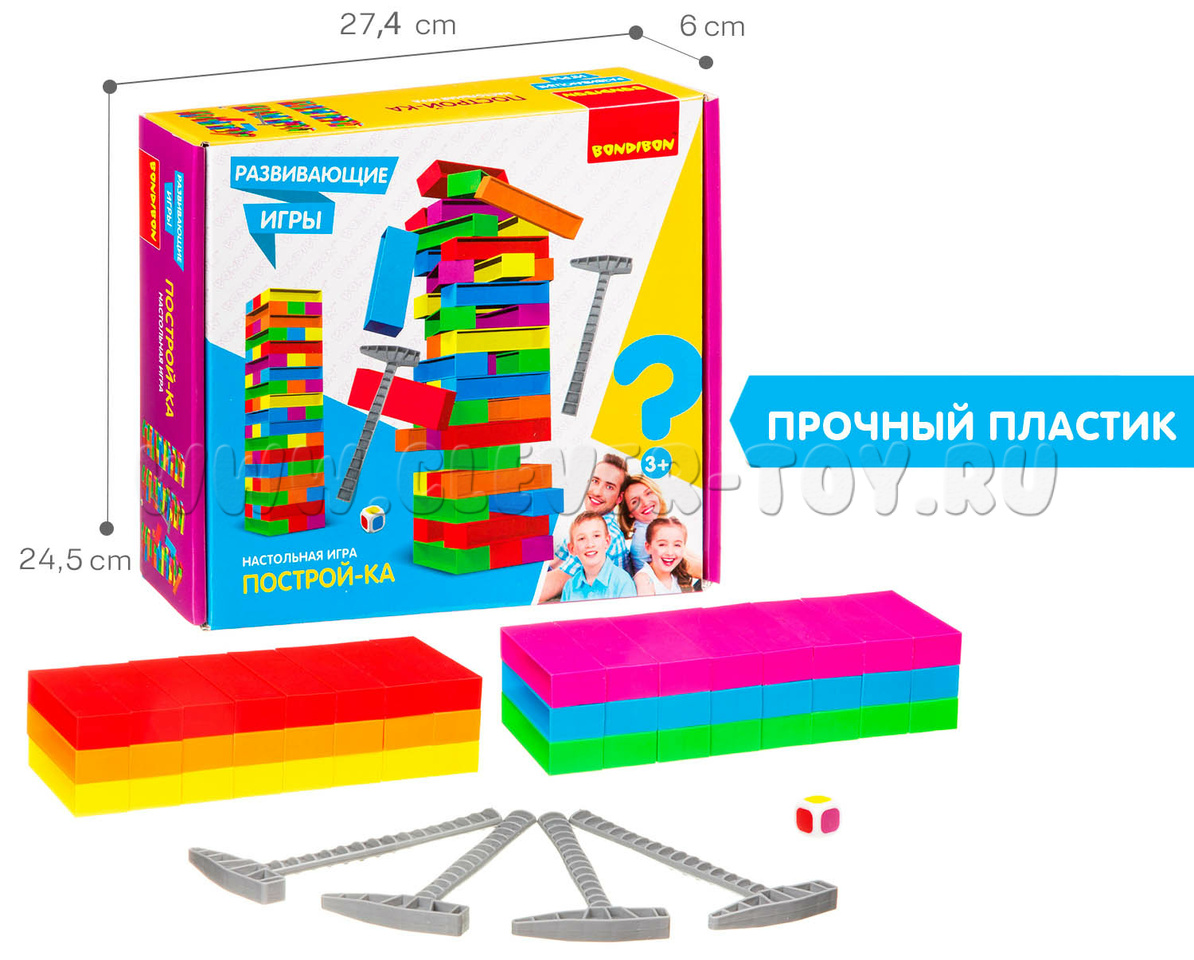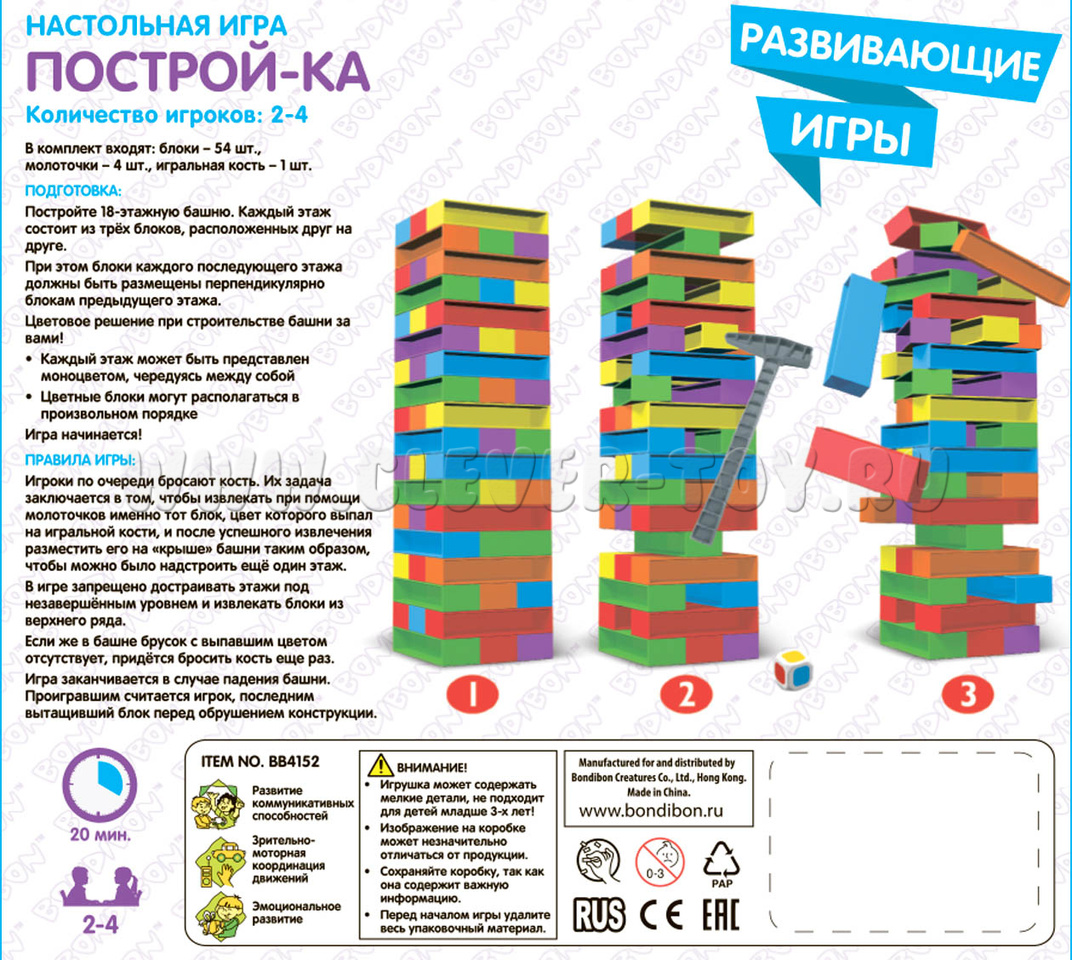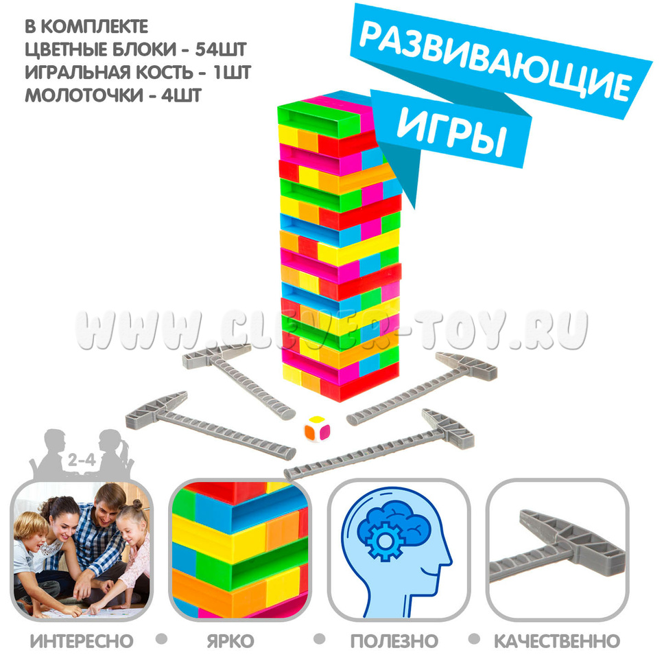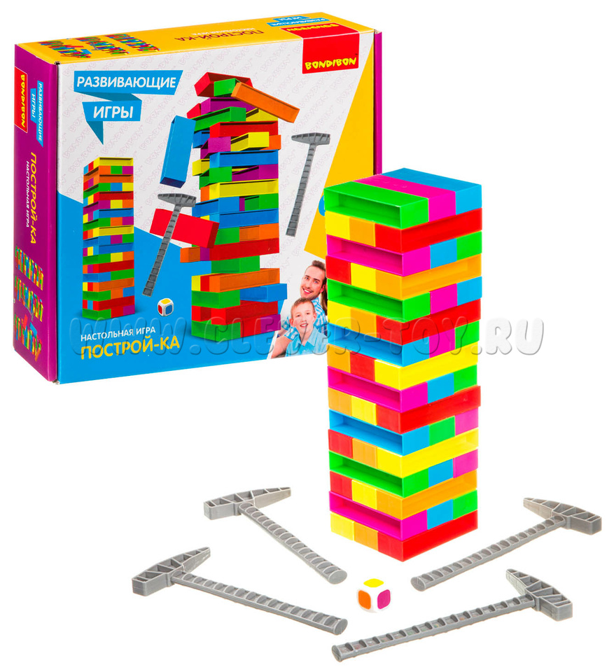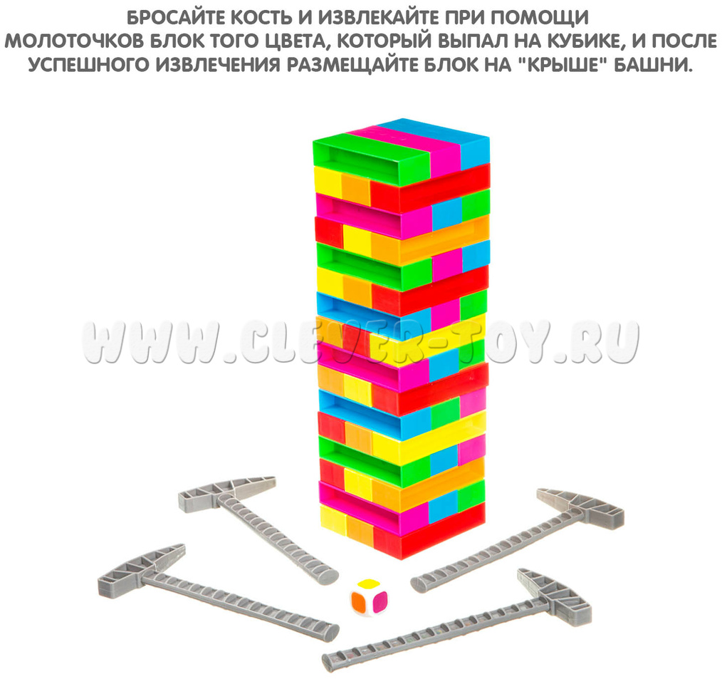 Строим башню в 18 этажей, а потом по очереди выбиваем молоточками блоки выпавшего на кубике цвета и кладем их сверху, пока всё не обрушится.