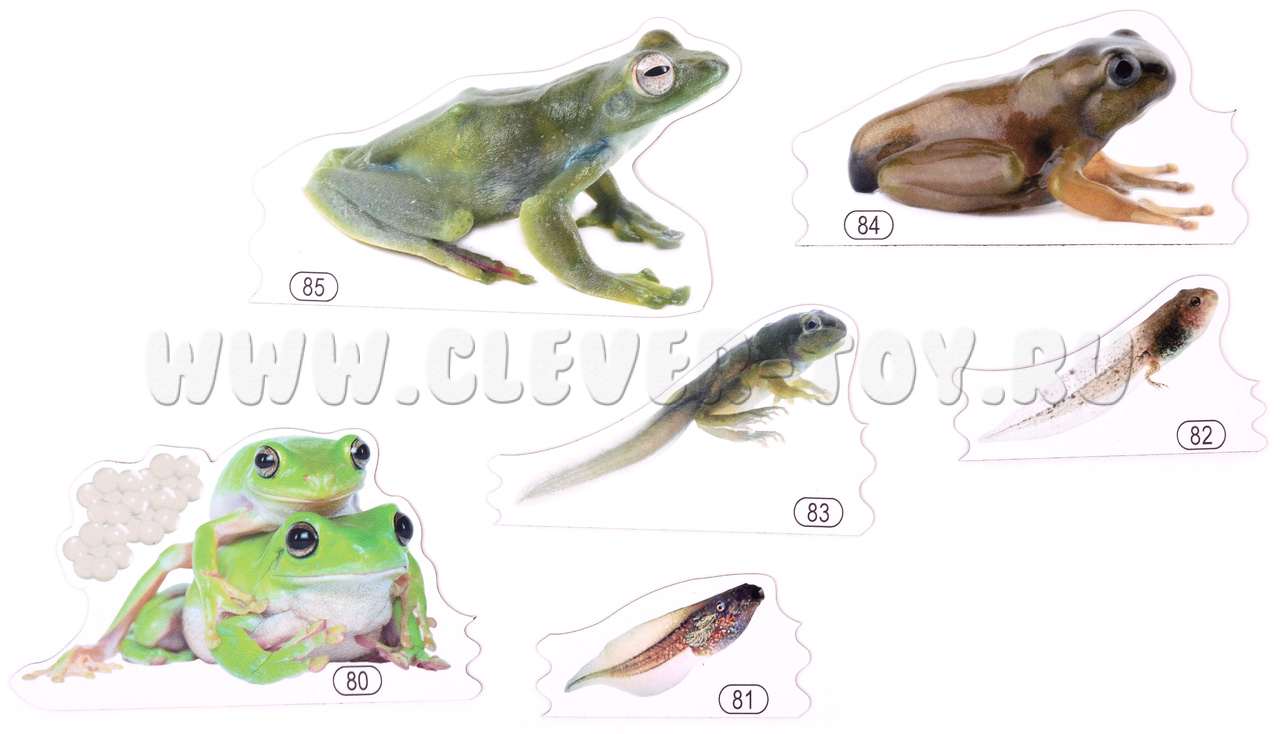 Карточки с изображениями: 80 спаривание лягушек, икра; 81 головастик с наружными жабрами; 82 головастик, у которого появились задние конечности; 83 головастик, у которого уже четыре конечности; 84 маленький лягушонок с остатком хвоста; 85 взрослая лягушка;