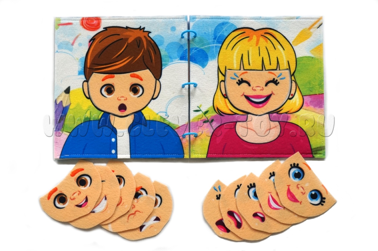На поле папки расположены лица мальчика и девочки. Они выполнены по типу вкладышей. Подобрав эмоцию, вложите её как вкладыш. В результате мальчик и девочка будут менять выражение лица.