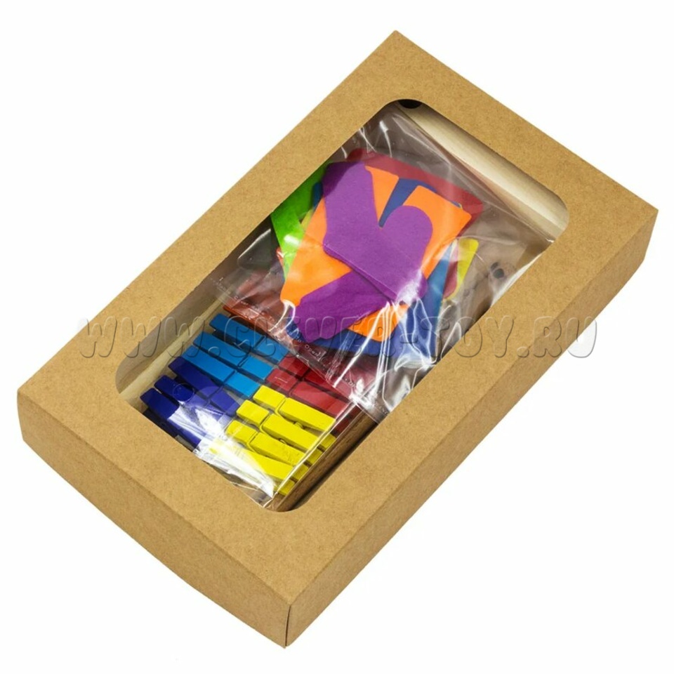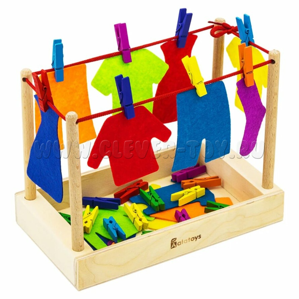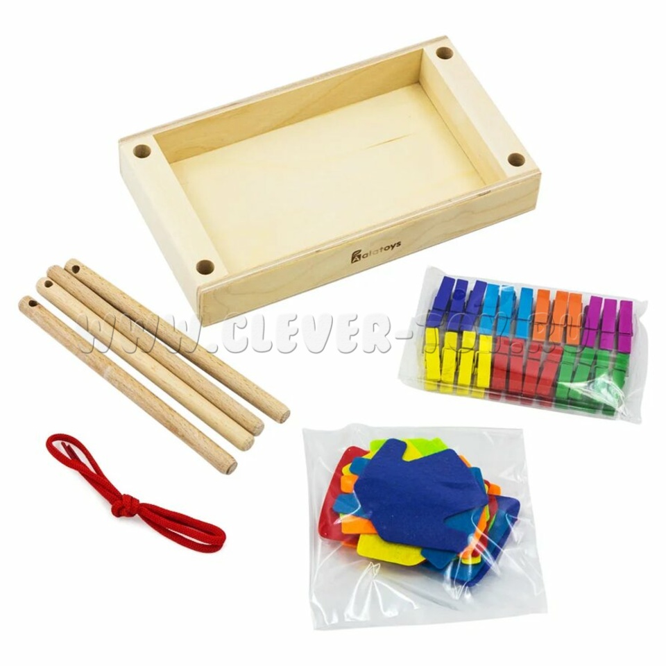 В наборе деревянные прищепки, предметы одежды из фетра, стойки и бельевая веревочка.