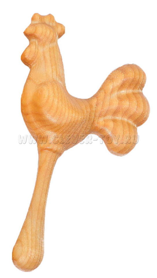 Форма погремушки - Петушок. Внутри - полая, наполнение - пшено, рис, гречка, сухой горох, бобы.