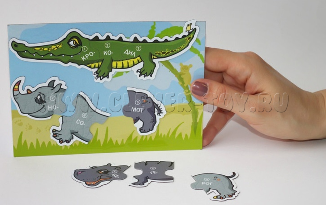 На поле нарисована жаркая Африка, в которой живут бегемот, крокодил, носорог. В нашем варианте каждый из них состоит из трех частей. Малыши должны правильно собрать этот забавный конструктор так, чтобы бегемот не был похож, допустим, на крокодила, а у носорога остался собственный, а не чужой хвост.