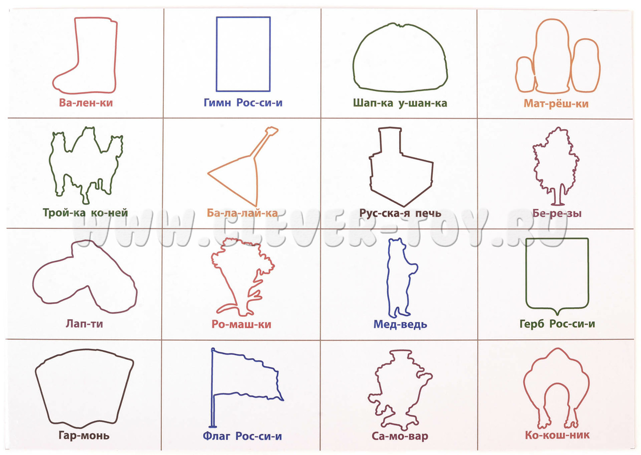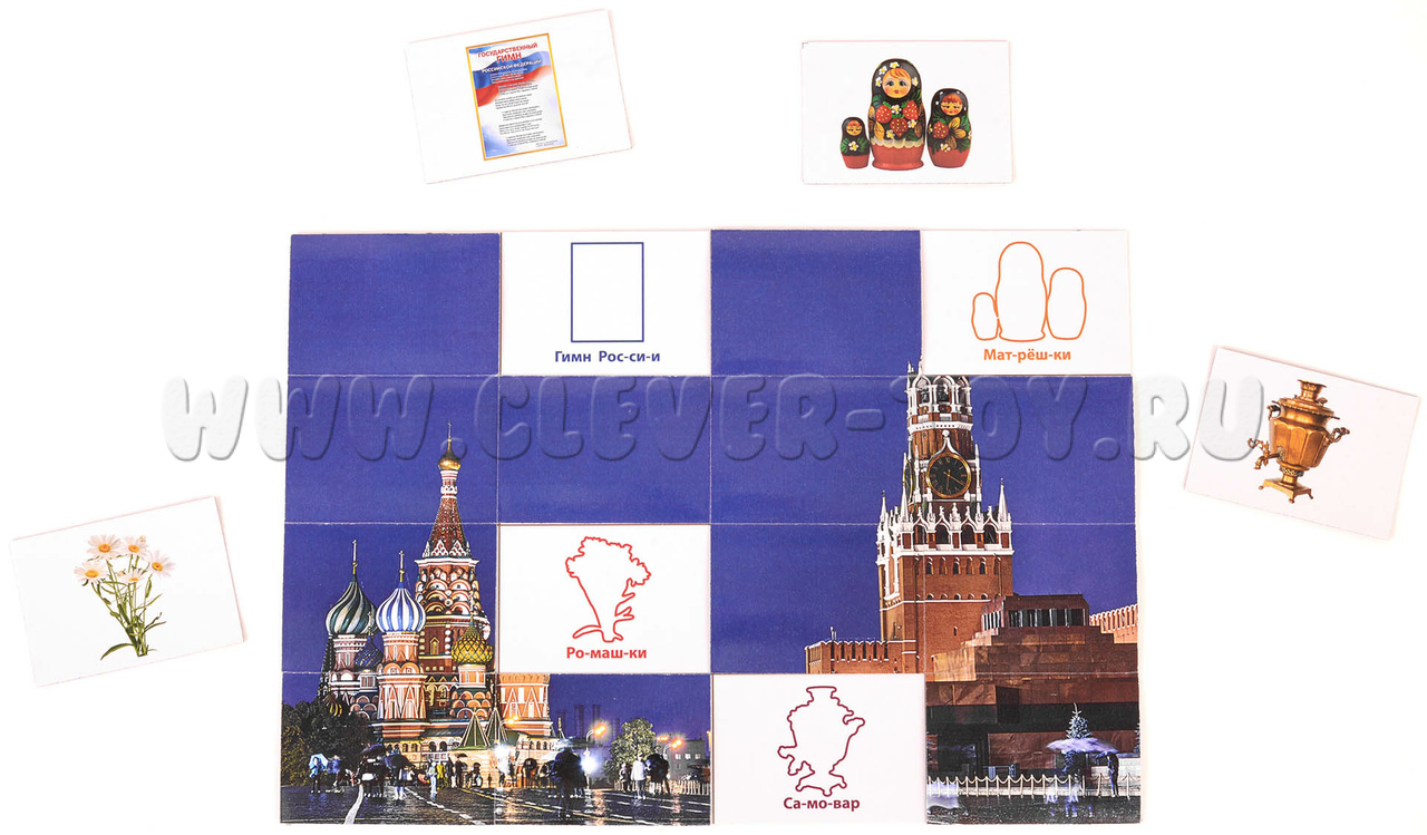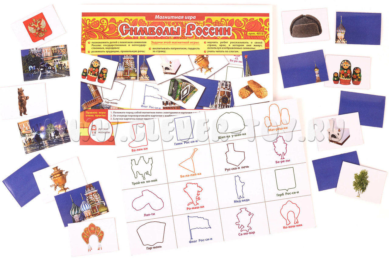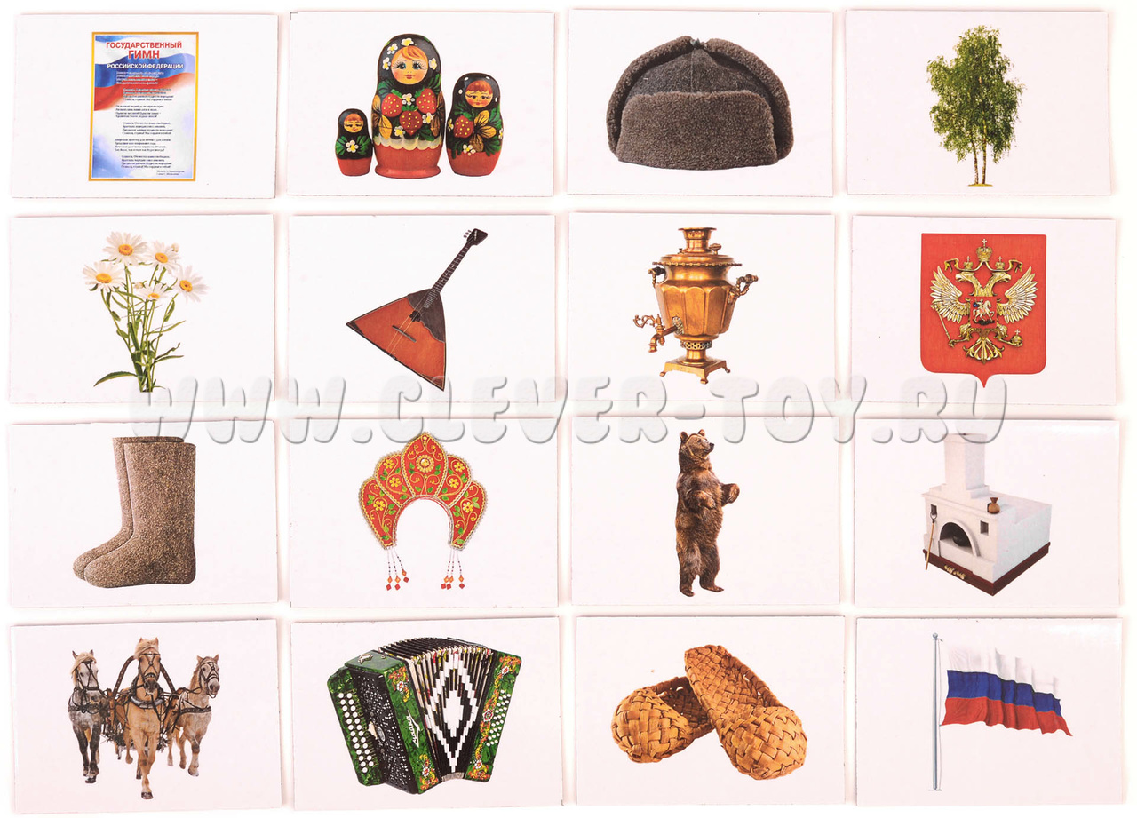 Что узнает ребёнок: В игре собраны символы России. Государственные: флаг, герб, гимн. Негосударственные: берёзы, гармонь, тройка лошадей, матрёшки и другие.