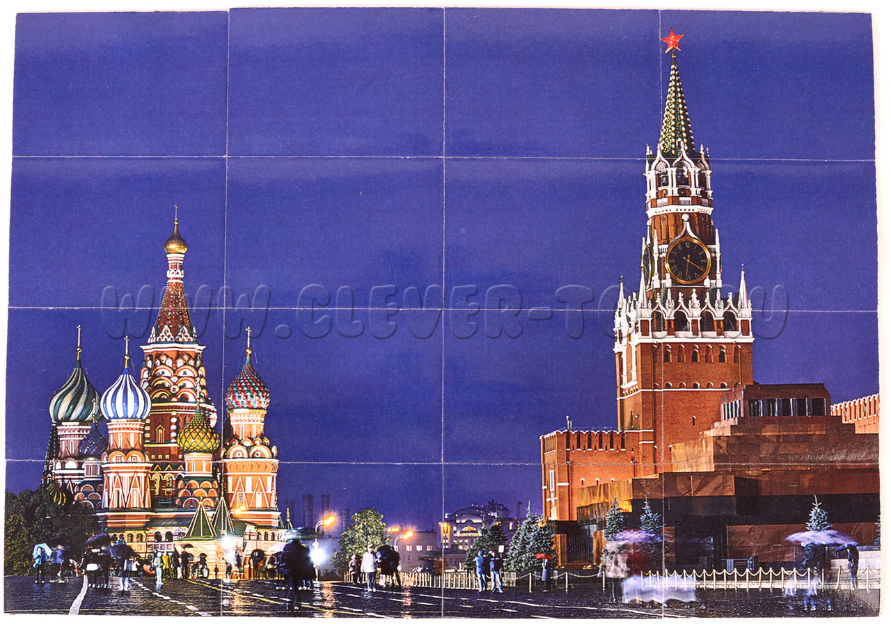 Задача ребёнка: совместить карточку с нужным контуром, перевернув её "лицом" вниз. Если всё правильно - с обратной стороны карточек сложится фотография Красной площади в вечерних огнях.