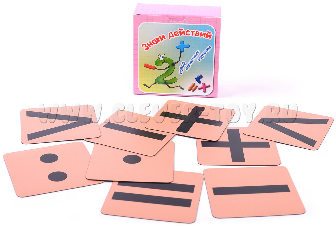 Когда мы, по просьбам учителей начальных классов, выпустили «Числа от 1 до 20», нам ничего не оставалось, как укомплектовать их знаками действий. Ведь это следующий важный шаг в освоении арифметики. Знаки действий мы выпускаем на оранжевом либо фиолетовом фоне, в каждом наборе 9 карточек, вот таких: