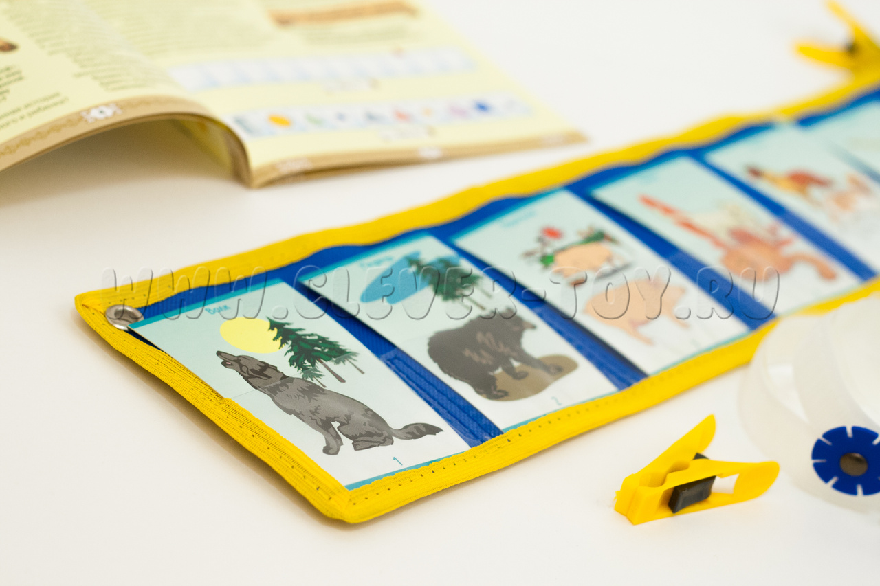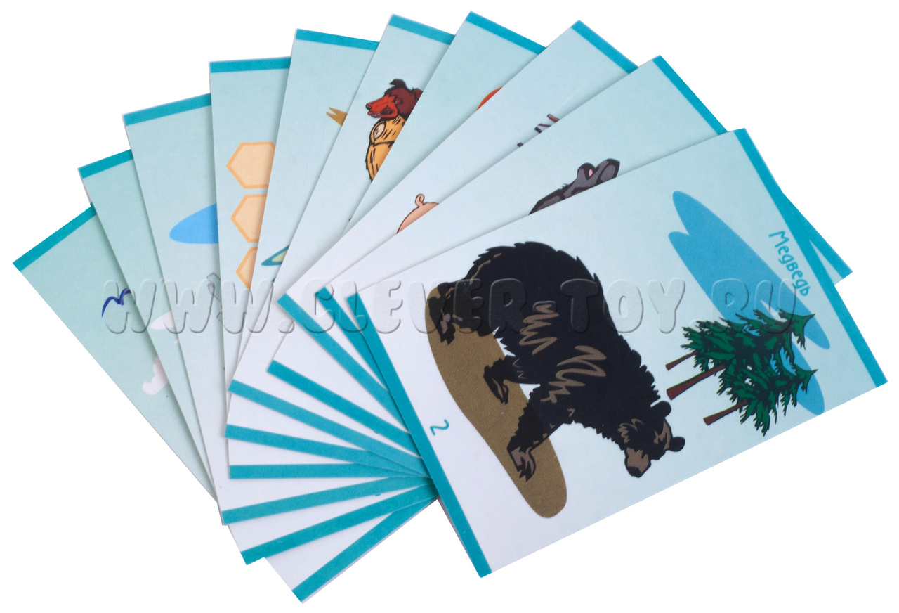 - 5 комплектов тематических картинок – «Геометрические фигуры», «Часы», «Грибы», «Транспорт», «Животные» - всего 50 карточек;