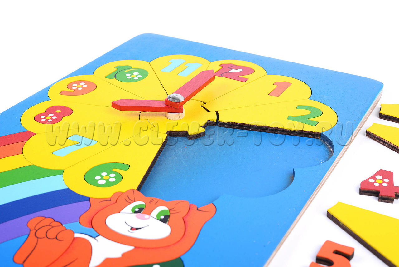 Набор состоит из схемы-раскраски, подложки и 38 съемных элементов. Стрелки подвижны и являются частью основы. Мозаика выполнена из натурального дерева и окрашена безопасными для здоровья ребенка красками на водной основе, которые остаются яркими, не стираются и не выгорают на солнце. Все части головоломки качественно отшлифованы, не гнутся, не ломаются и не смогут поранить или оцарапапть малыша.