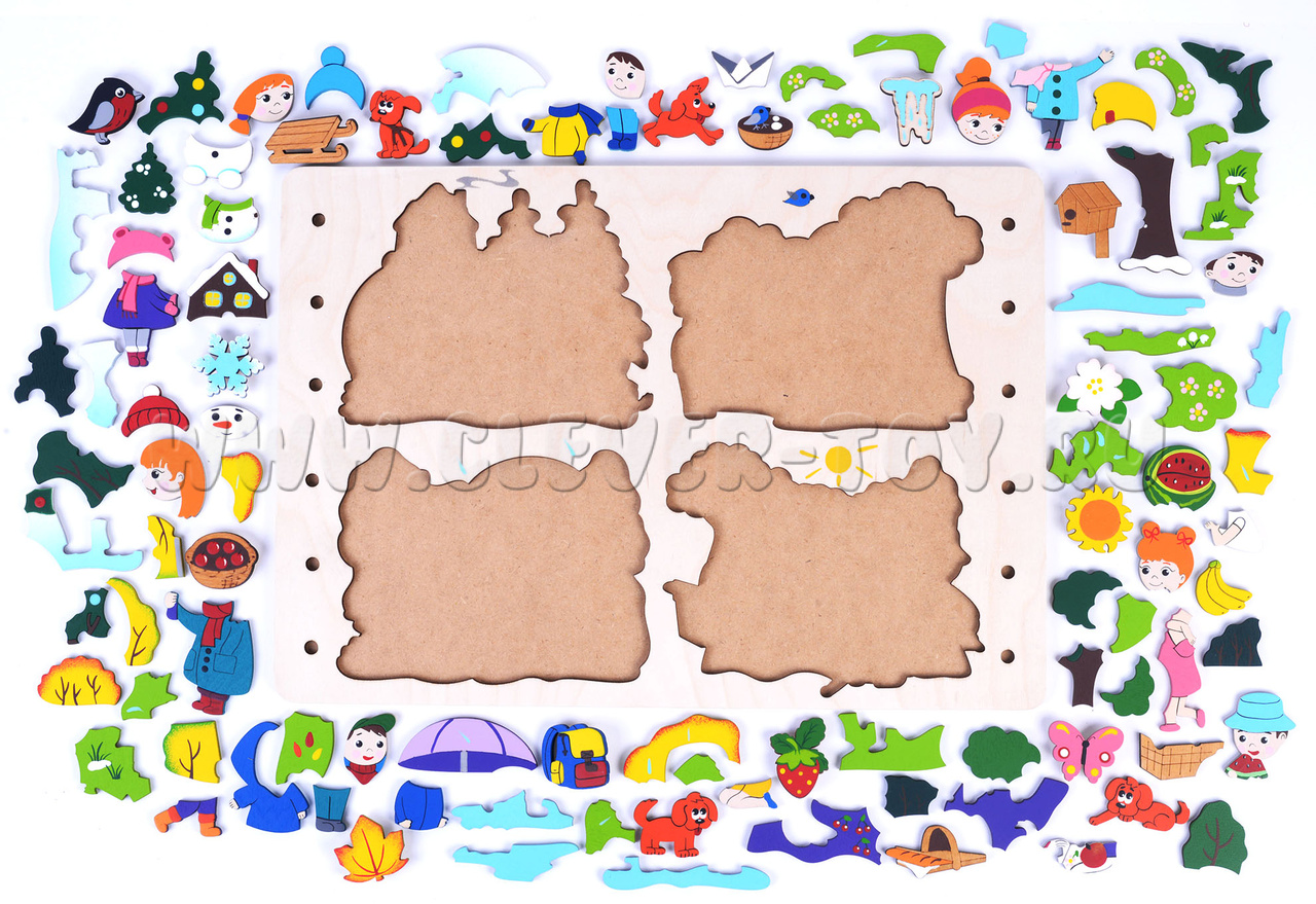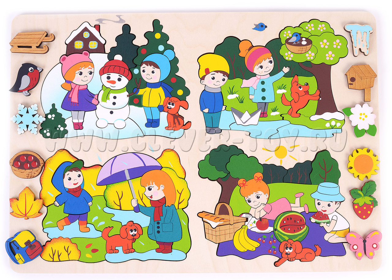 Как играть: Задача ребенка - опираясь на логику, выбрать и расположить съемные элементы картинки к соответствующему времени года.