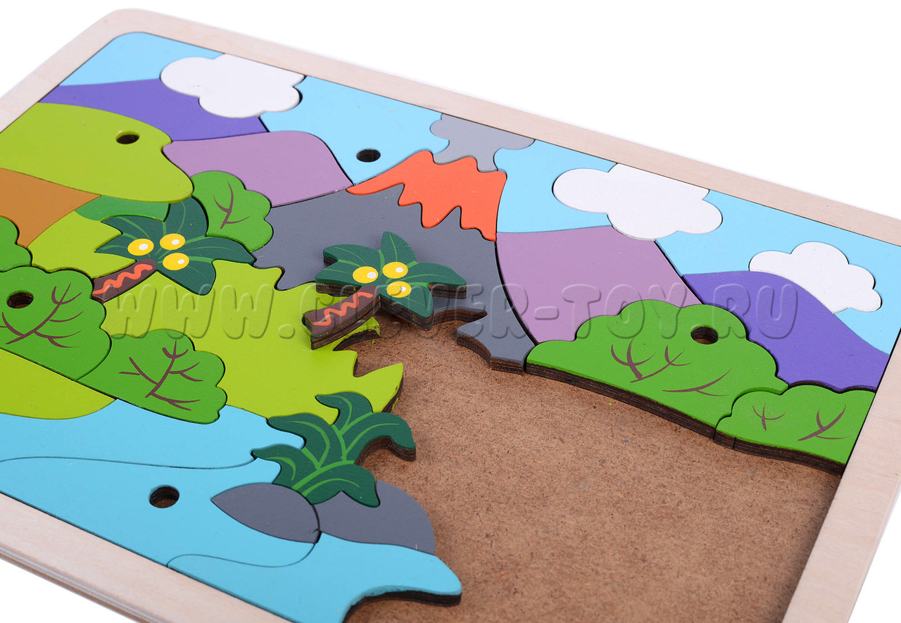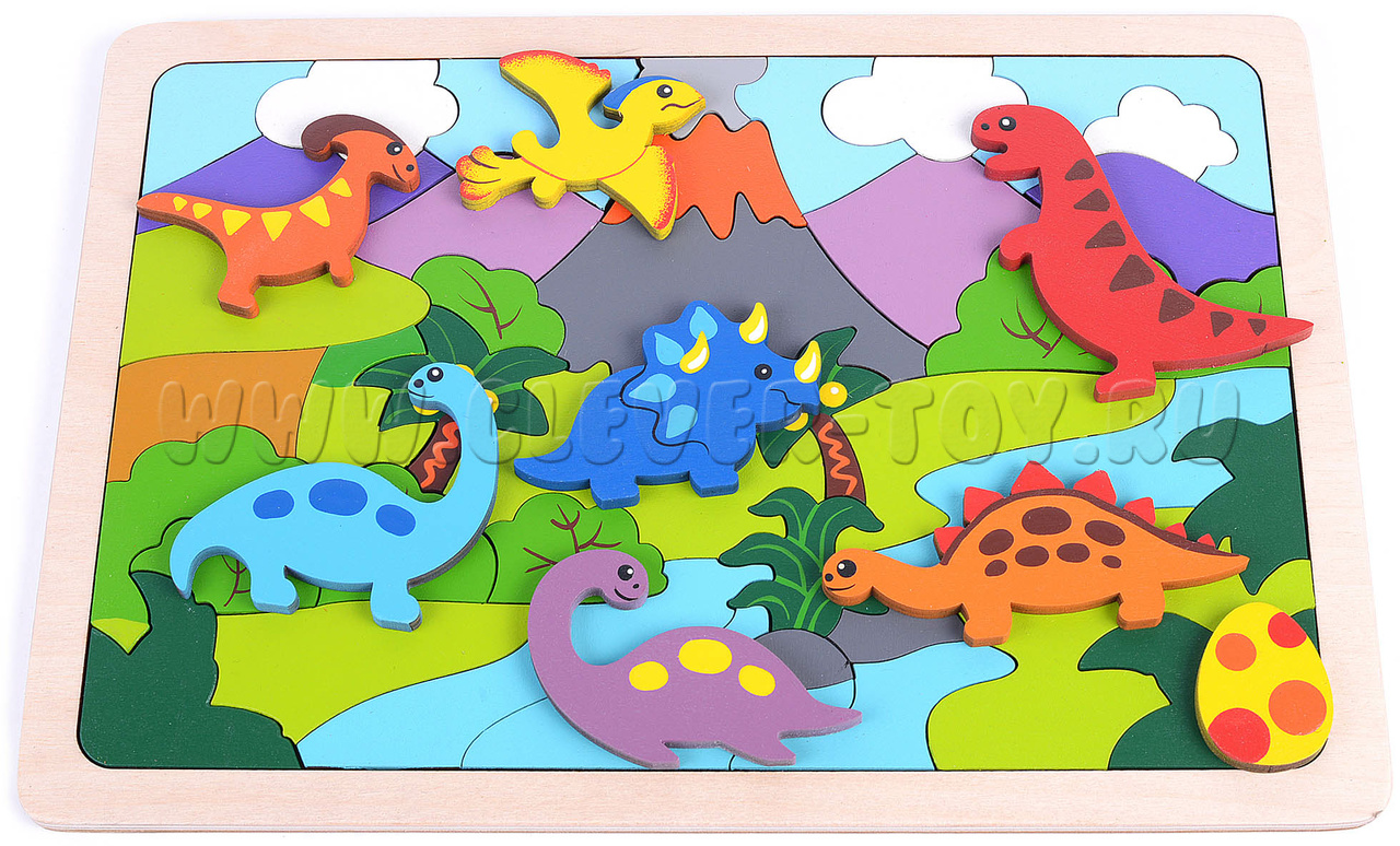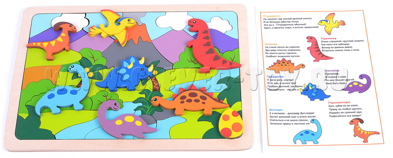В комлекте: цветная схема сборки с названием динозавров, вкладыш со стихами-загадками про динозавров.
