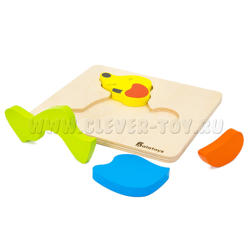 Пазл «Собачка» представляет собой деревянную основу с углублениями для размещения деталей собачки. Только правильно подобрав детали по форме и размеру, у ребёнка получится сложить правильные пазлы. Не забывайте хвалить малыша при каждом верном действии.