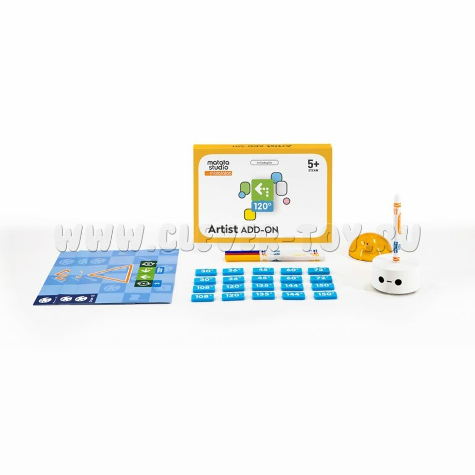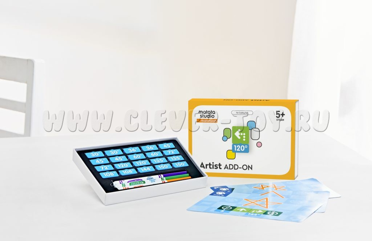 Набор расширяет возможности комплекта Matatalab Coding set и позволяет запрограммировать робота на рисование различных геометрических фигур, развивая пространственное мышление и формируя у детей математические понятия угловых величин.