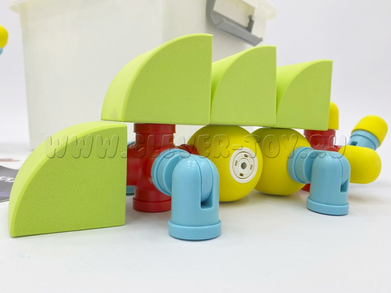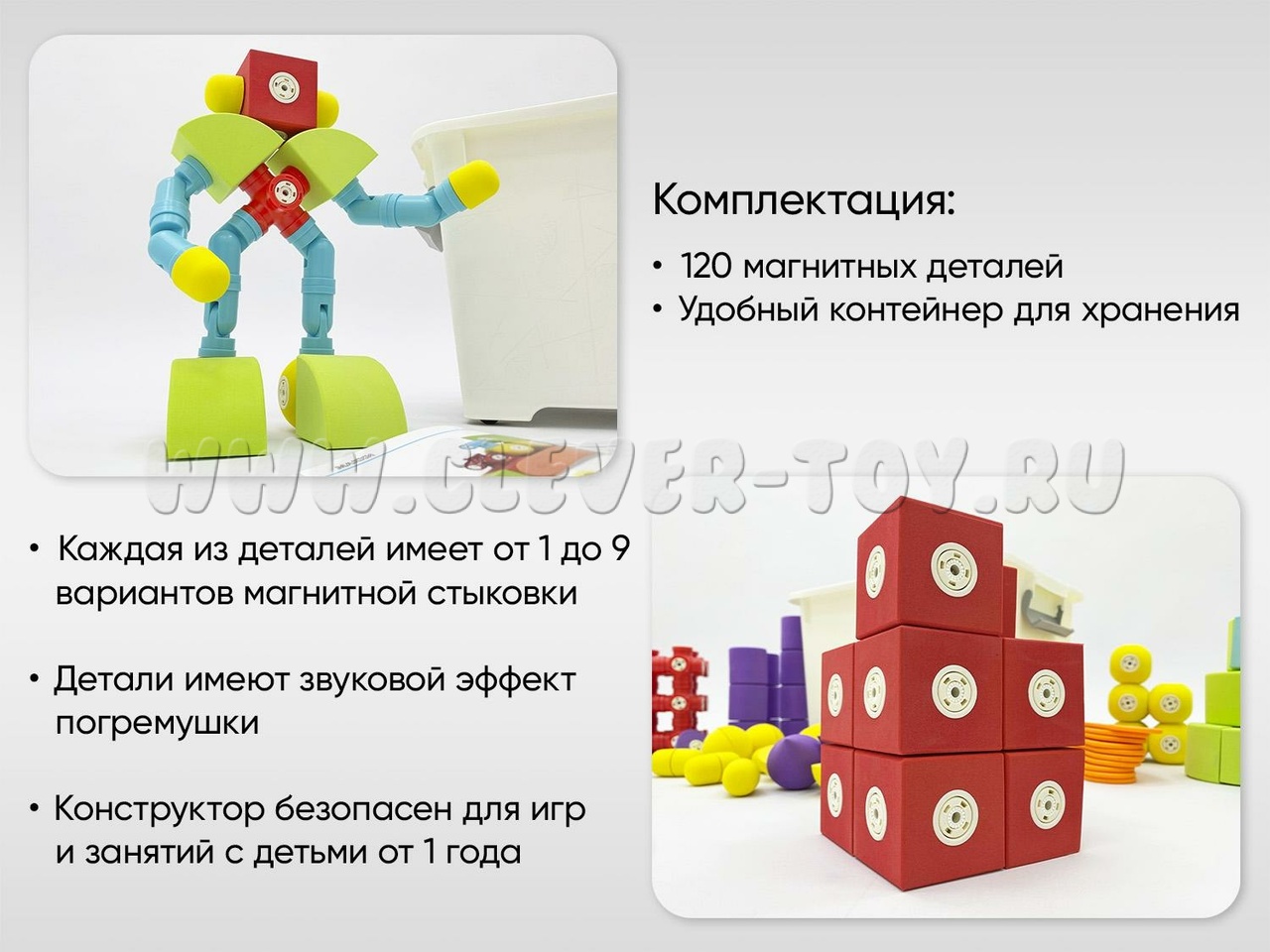Детали конструктора окрашены в приятные однотонные цвета, со звуковым эффектом погремушки. Каждая из деталей имеет от 1 до 9 вариантов магнитной стыковки, что практически не ограничивает ребенка в конструировании. Простые детали отлично подходят для детей младшей группы ДОУ, детей с ОВЗ и РАС. Более сложные по форме и креплениям детали предназначены для детей средней и старшей группы.