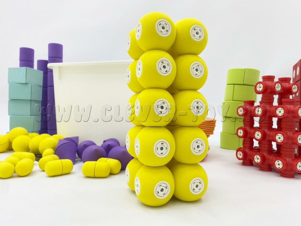 Детали конструктора окрашены в приятные однотонные цвета, со звуковым эффектом погремушки. Каждая из деталей имеет от 1 до 9 вариантов магнитной стыковки, что практически не ограничивает ребенка в конструировании. Простые детали отлично подходят для детей младшей группы ДОУ, детей с ОВЗ и РАС. Более сложные по форме и креплениям детали предназначены для детей средней и старшей группы.
