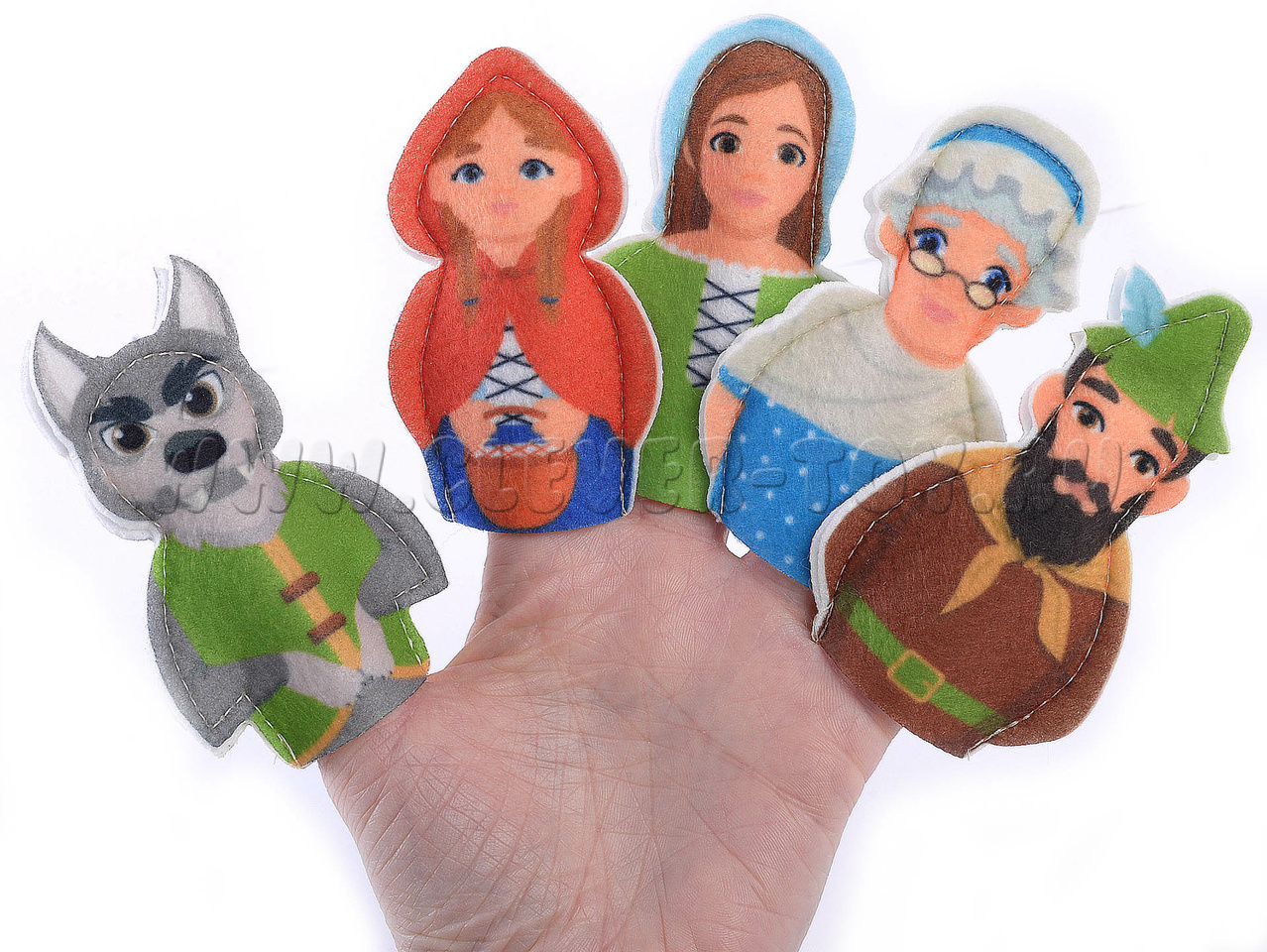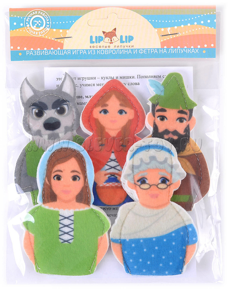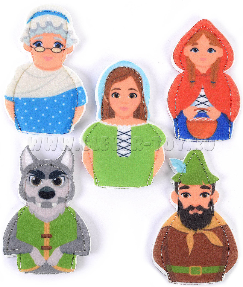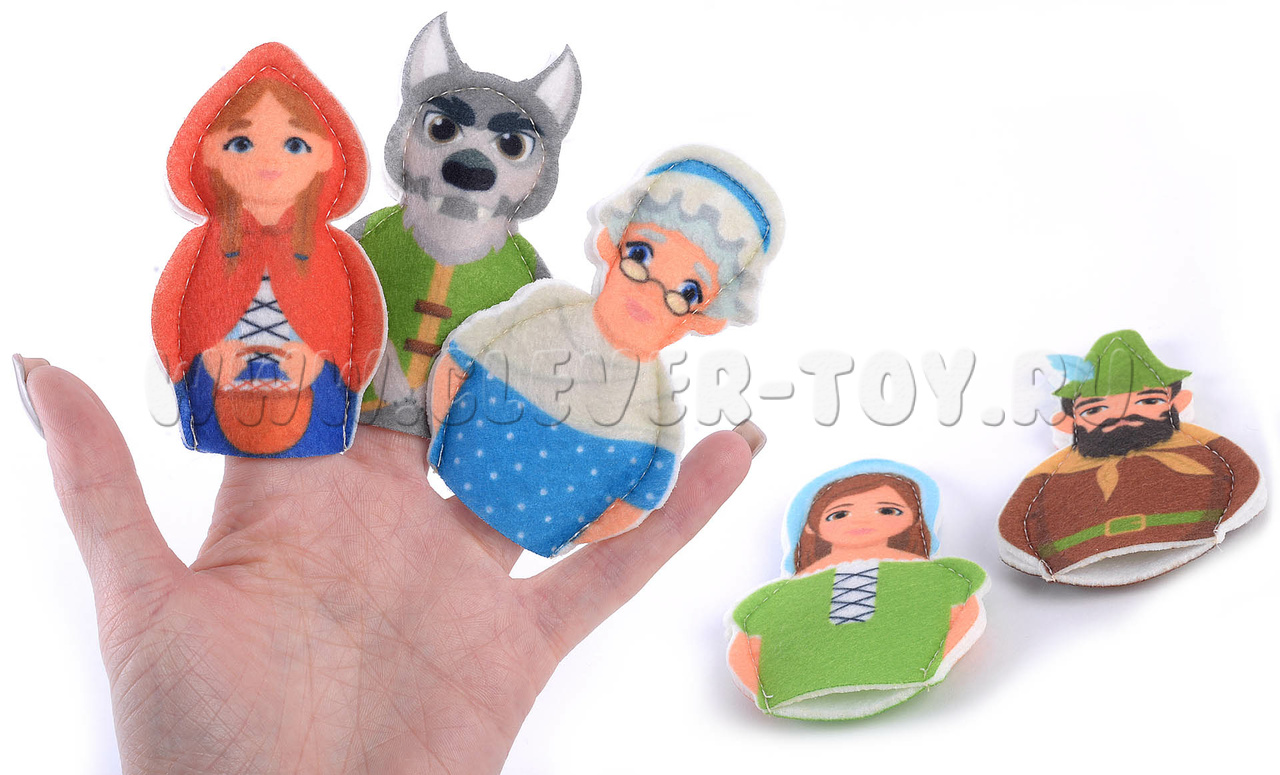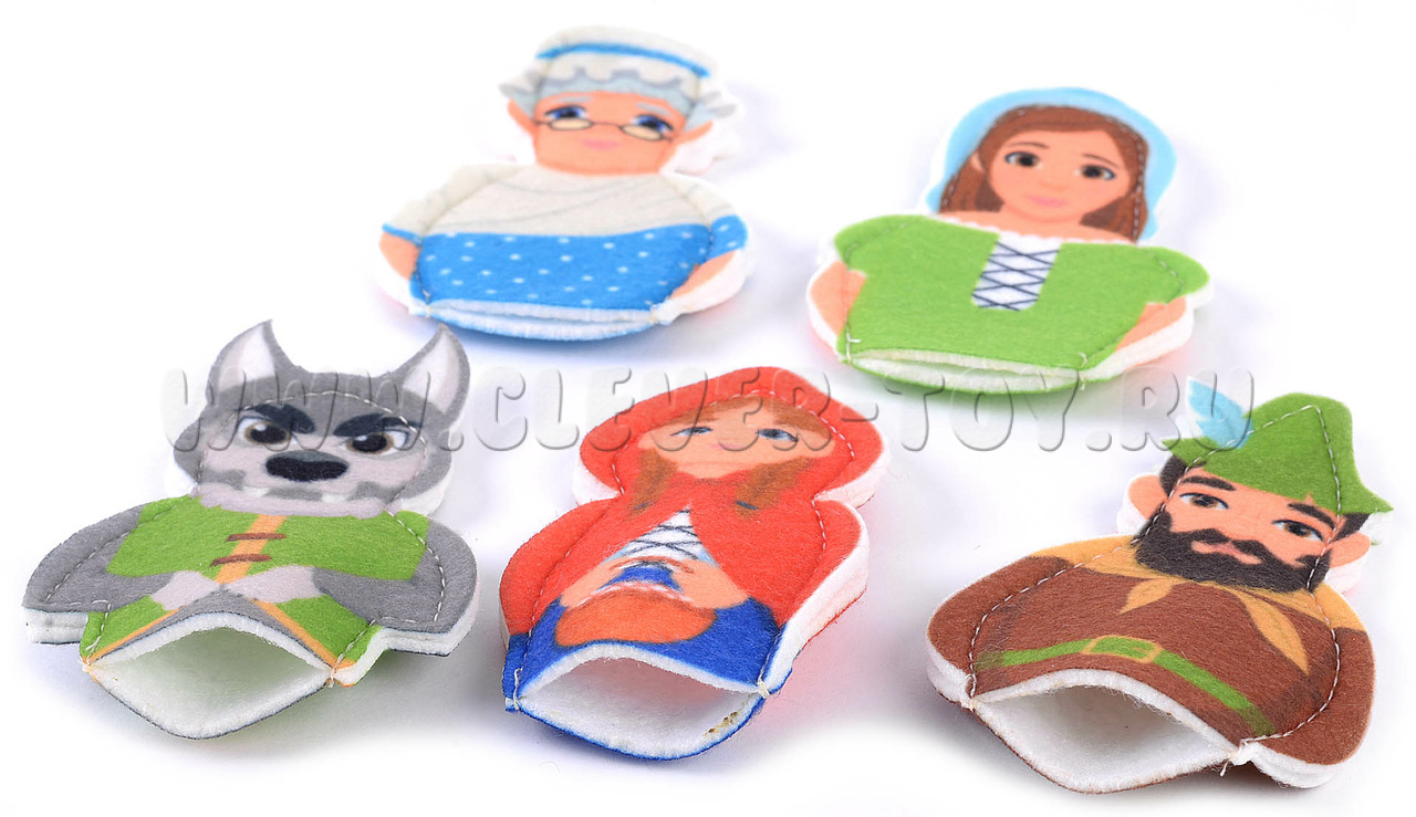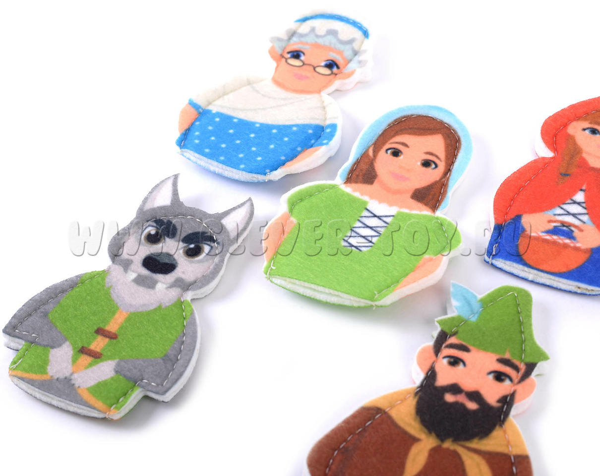 Набор пальчикового театра состоит из: 6 фигурок (размер: 9 см) с изображением сказочных персонажей сказки Красная шапочка (Красная шапочка, Мама, Бабушка, Волк, Охотник) и инструкция с описанием игр.