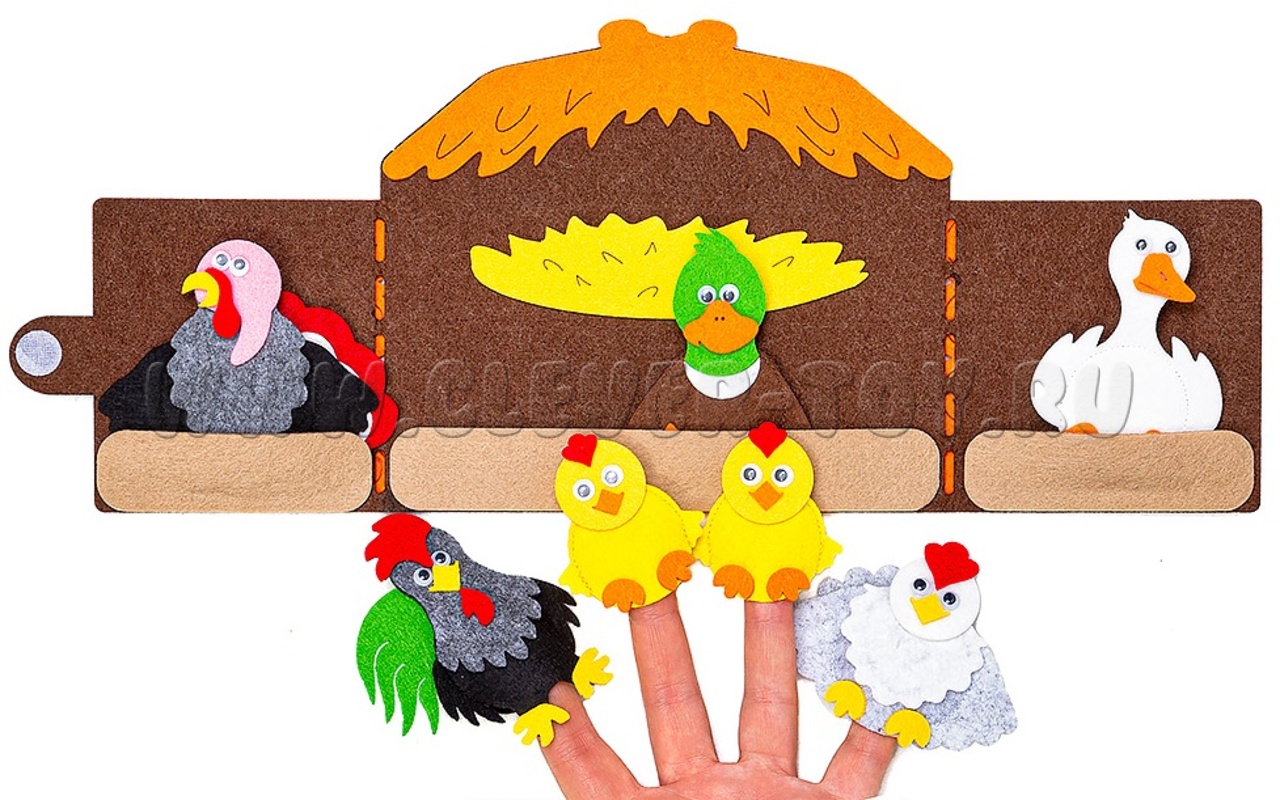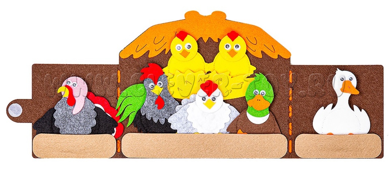 Птицы внутри: Гусь, петух, курица, два цыплёнка, зелезень, индюк. Так же в пособии прилагается инструкция с описанием развивающих игр.