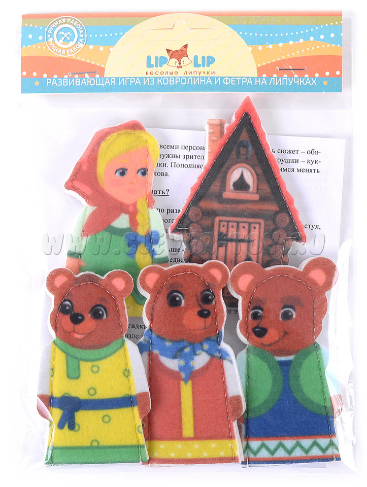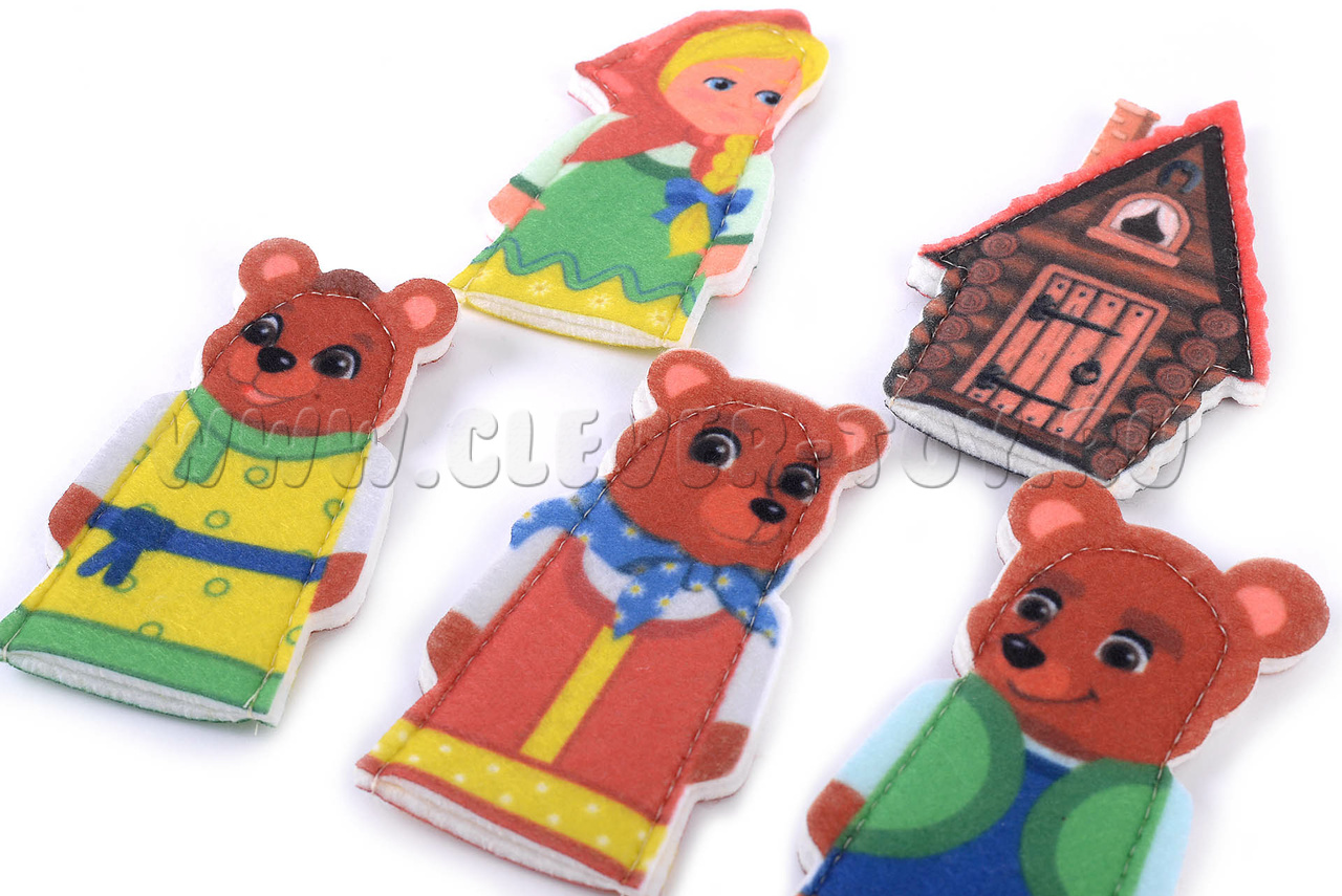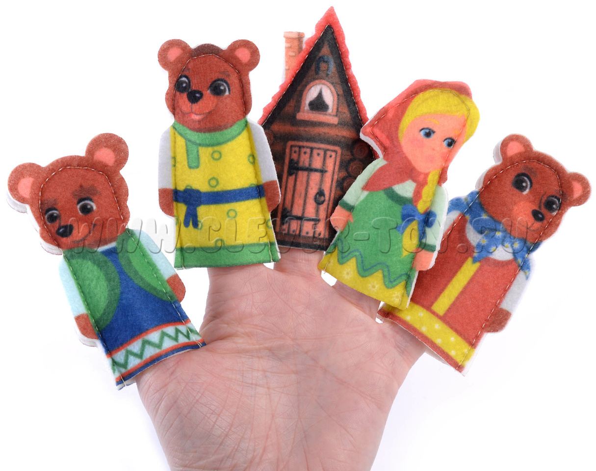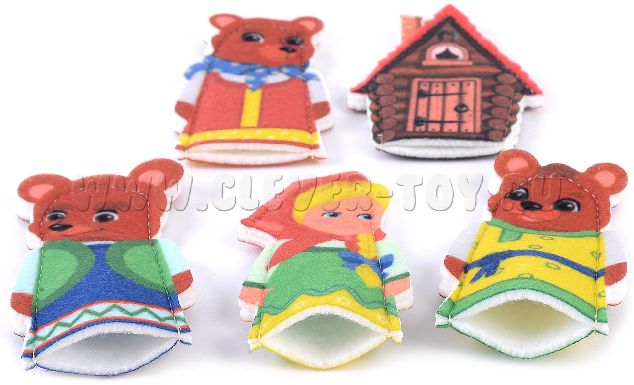 Набор пальчикового театра состоит из: 5 фигурок (размер: 9 см) с изображением сказочных персонажей сказки Три медведя (Мама, Папа медбведь, Сын Мишутка, девочка Маша, Терем) и инструкция с описанием игр.