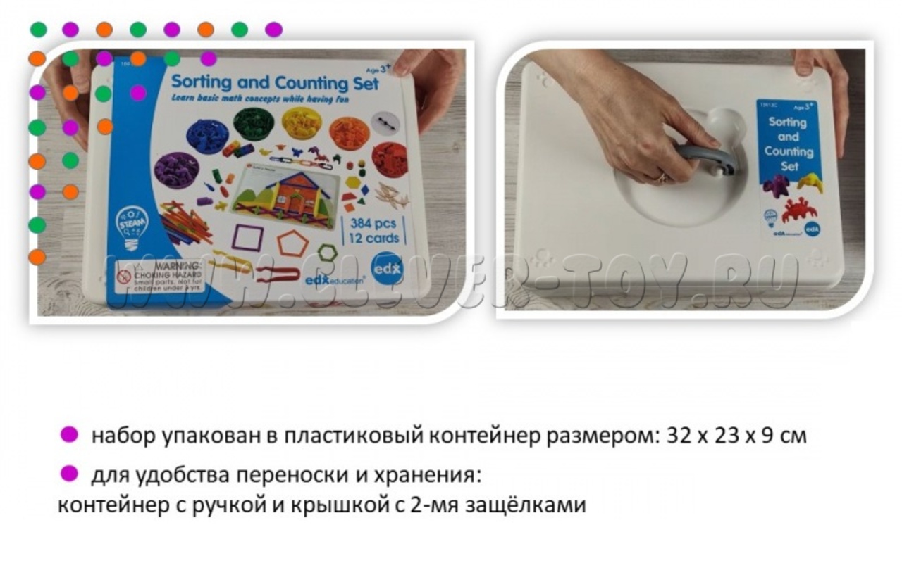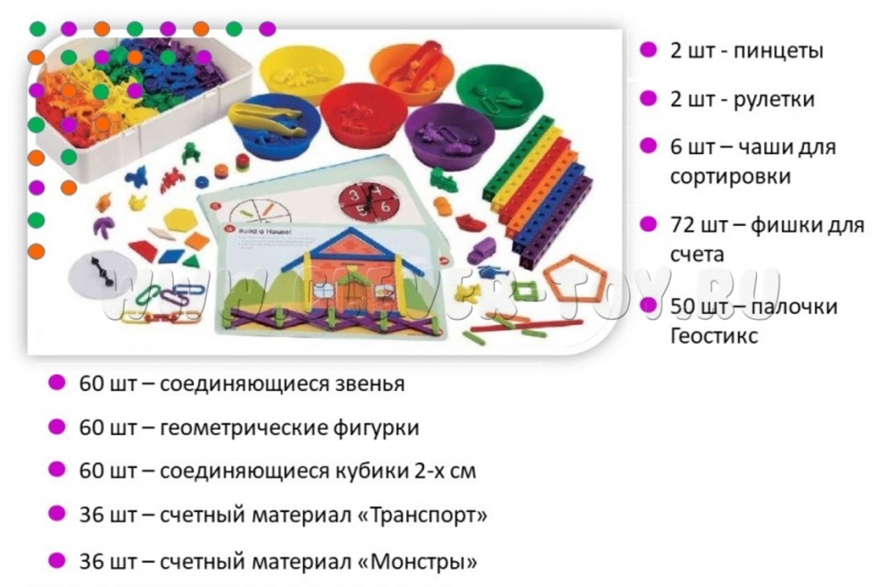 Набор для группы "Счет и сортировка" предназначен для изучения основ математики, способствует развитию мелкой моторики, логического и творческого мышления.
