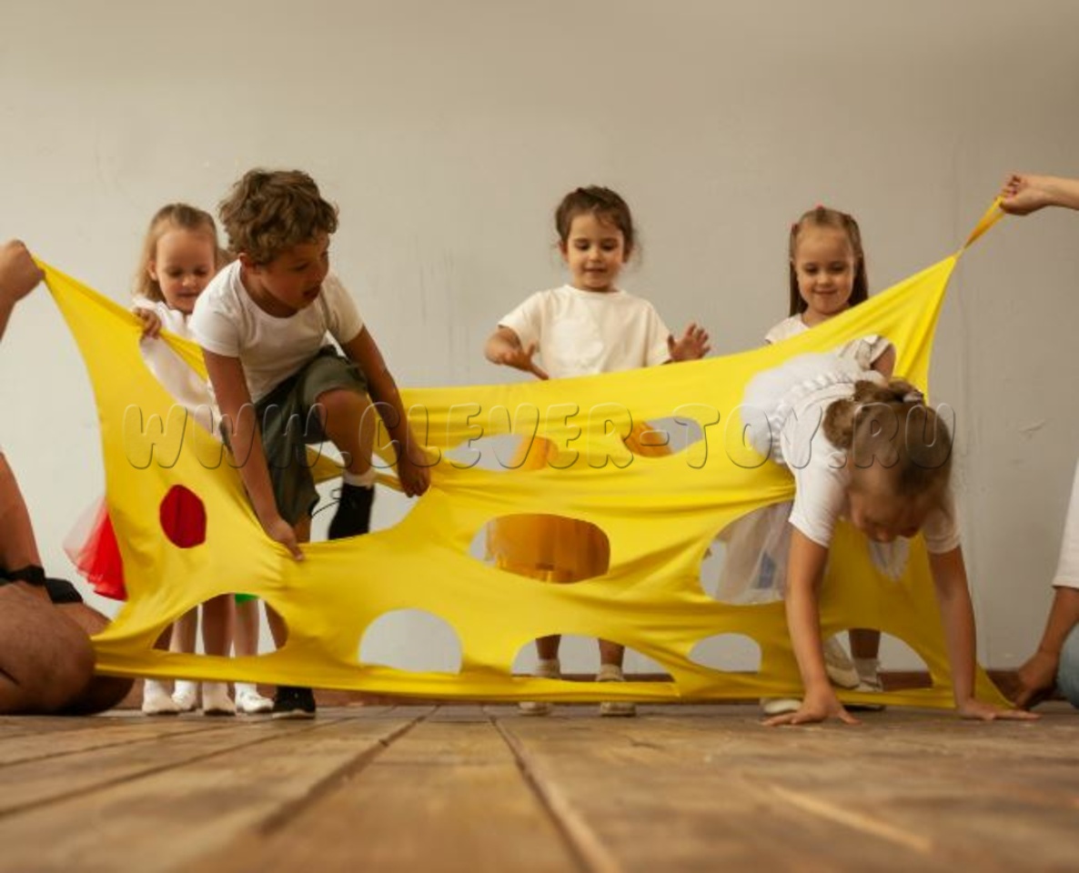 Ведущие натягивают сыр горизонтально над головами у детей. Дети танцуют под полотном, пока играет музыка, как только музыка останавливается, ведущие опускают сыр к полу. Задача детей успеть выбежать до того, как их накроет полотно сыра.