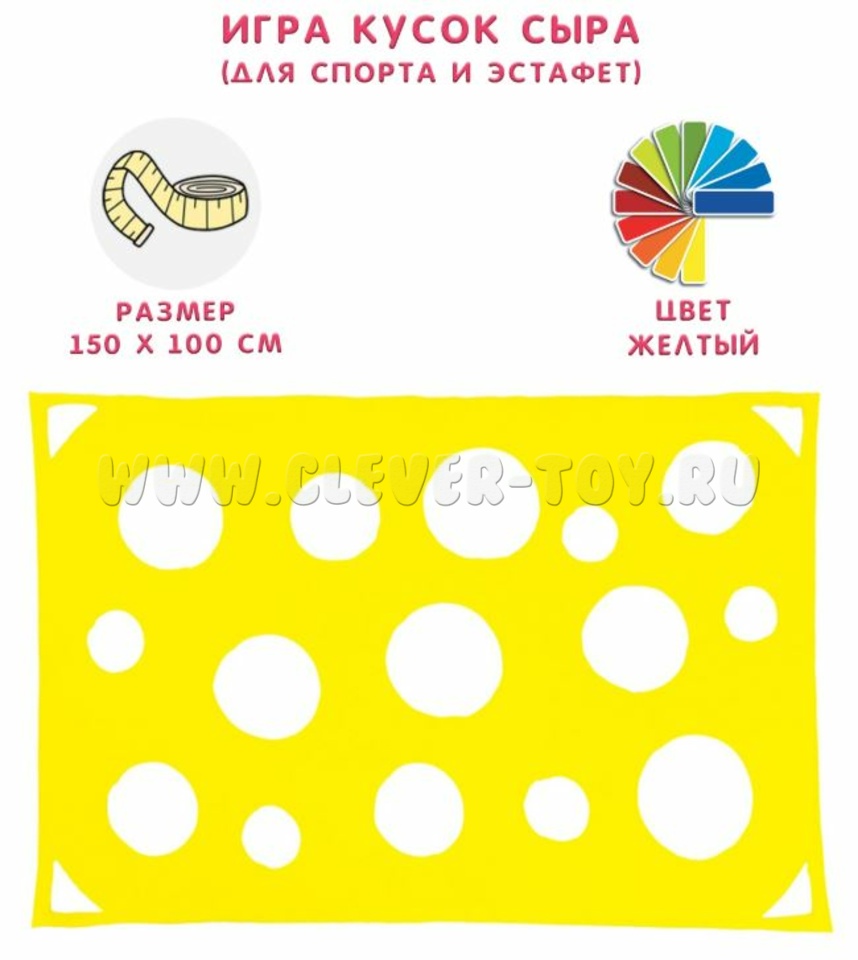 Двое ведущих с двух сторон вертикально натягивают сыр (верхняя резинка в руке, нижняя надета на ногу). Задача детей пролезть сквозь различные отверстия гигантского сыра.