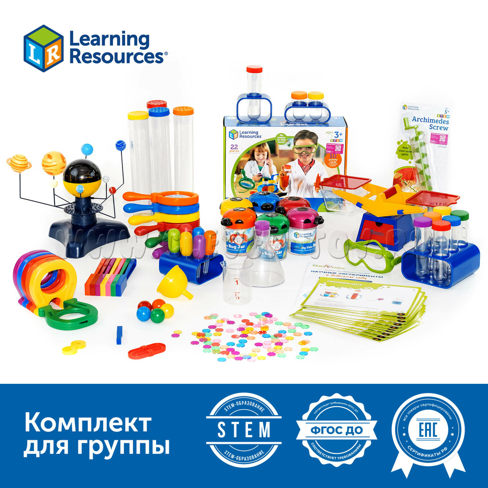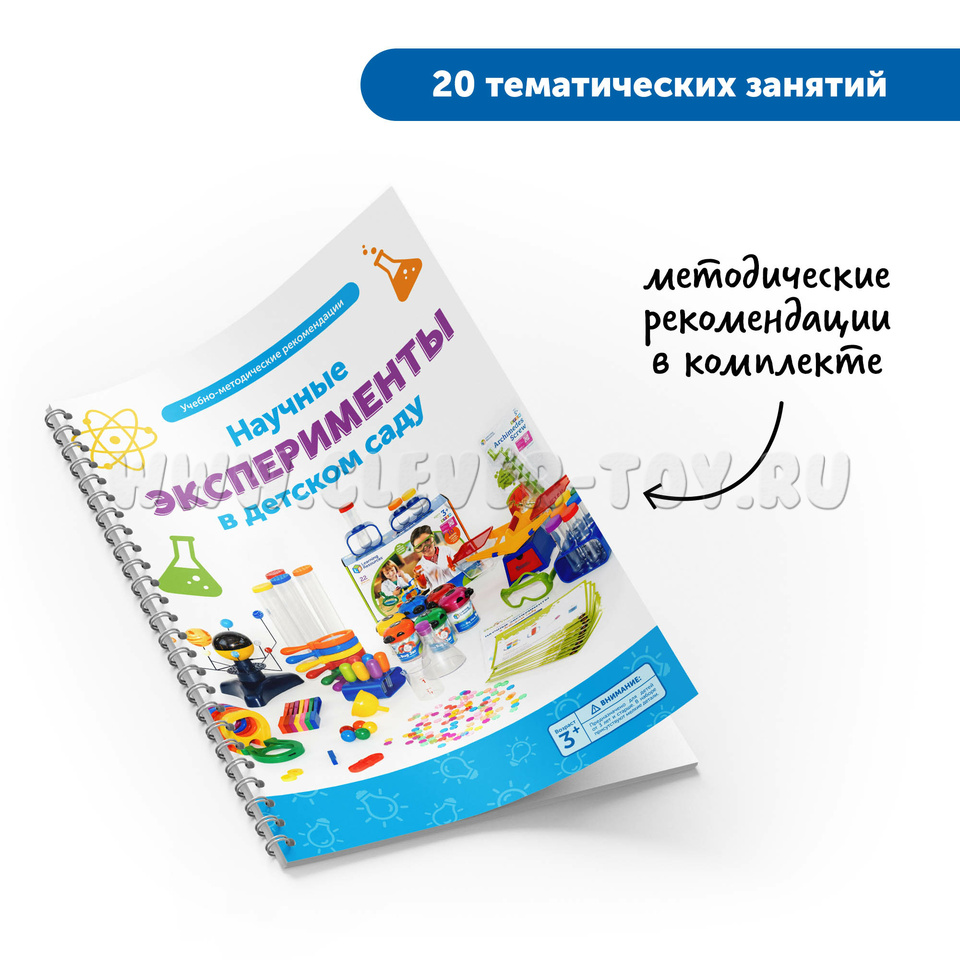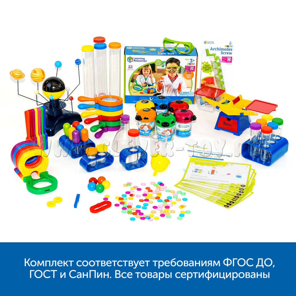 - Оборудование для экспериментов (Мерный стакан, Гигантская лупа, Воронка, Пипетка, Колба, Пинцет, Очки, Большая пробирка с подставкой, Пробирки с подставкой, Карточки с заданиями, Архимедов винт)