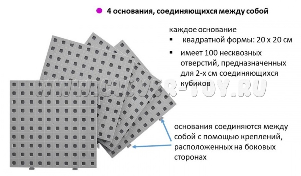 Набор из 4-х квадратных оснований (20 х 20 см, серого цвета) предназначен для 2-х см. соединяющихся кубиков.