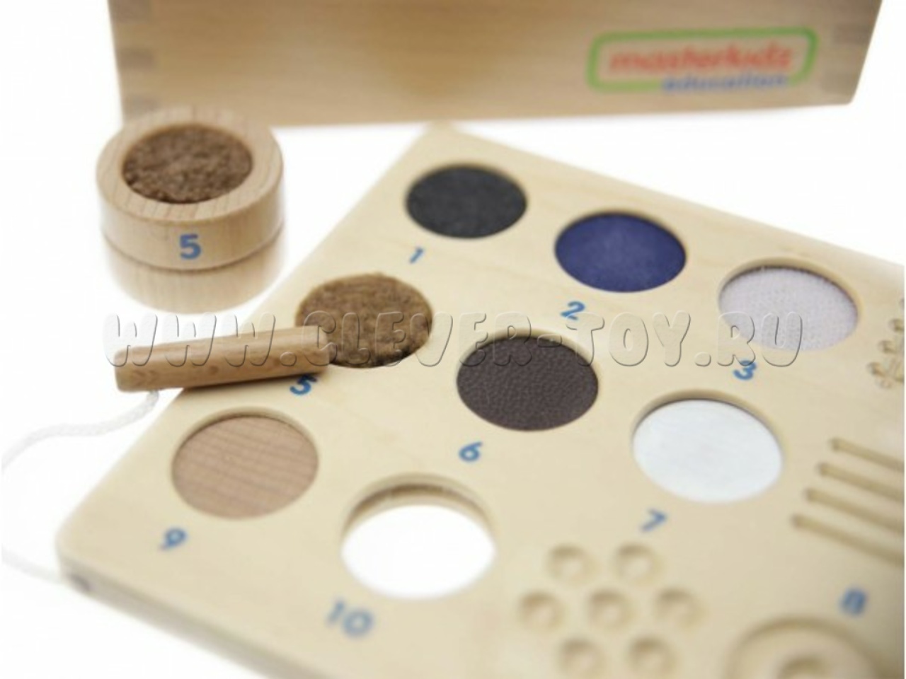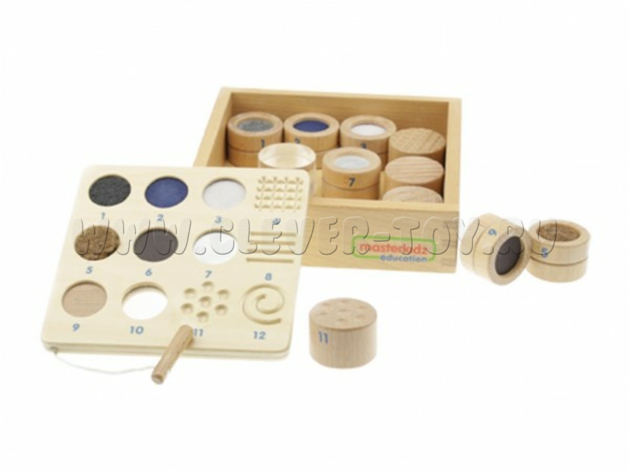• 12 деревянных бочонков с номерами, имеющих различные текстуры или рельефные рисунки на верхней поверхности. Можно использовать с набором "Тактильный ящик" (артикул ME04055)