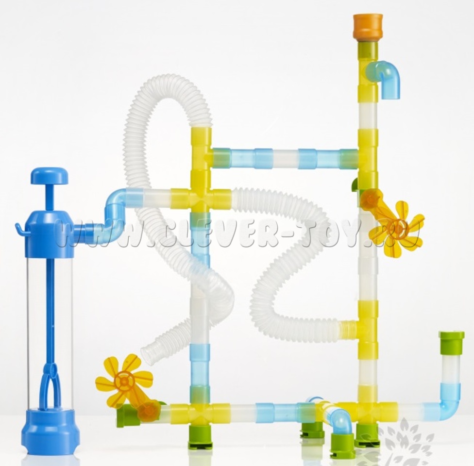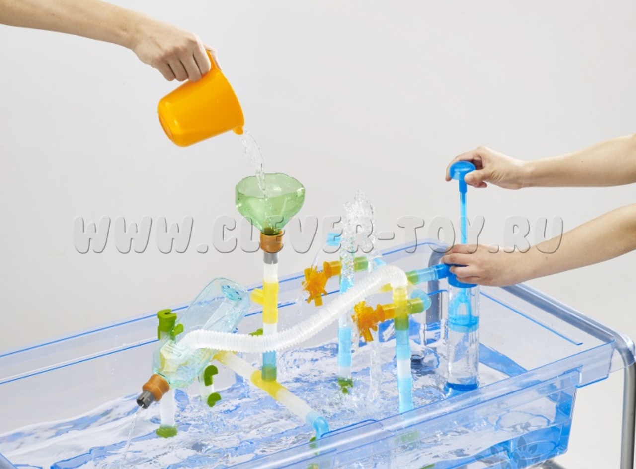 Дети могут сконструировать собственную систему водоснабжения, смогут наливать и перекачивать воду, одновременно развивая важные двигательные навыки и изучая измерение, счет, экспериментирование, творчество, социальные навыки, командную работу и наблюдение посредством интересных и веселых занятий с водой.