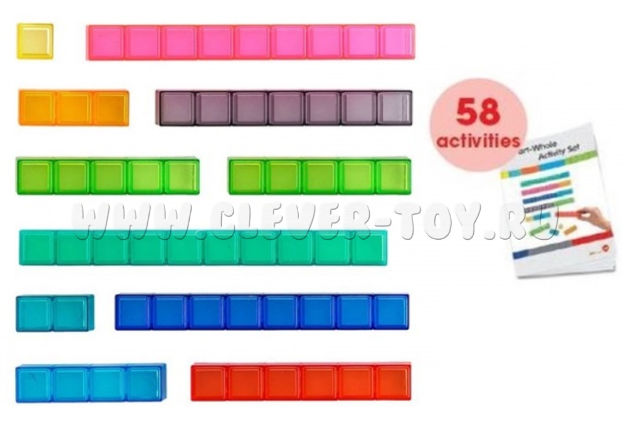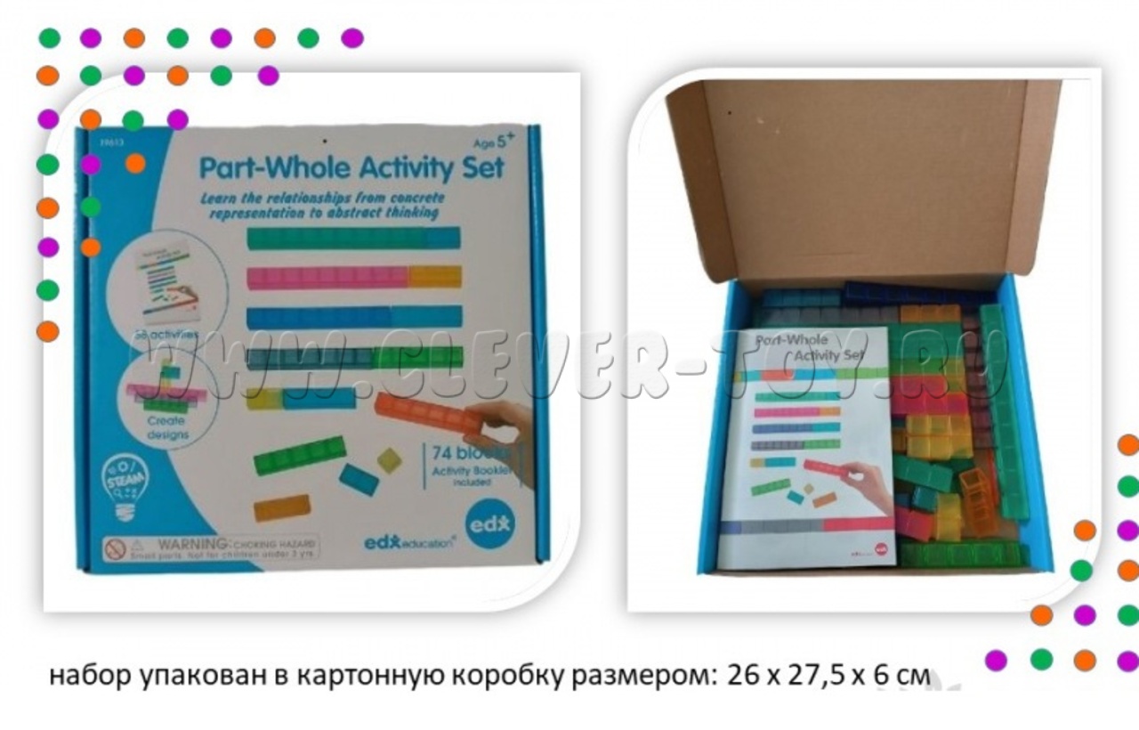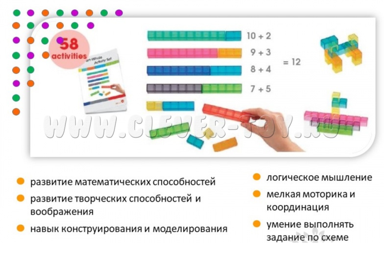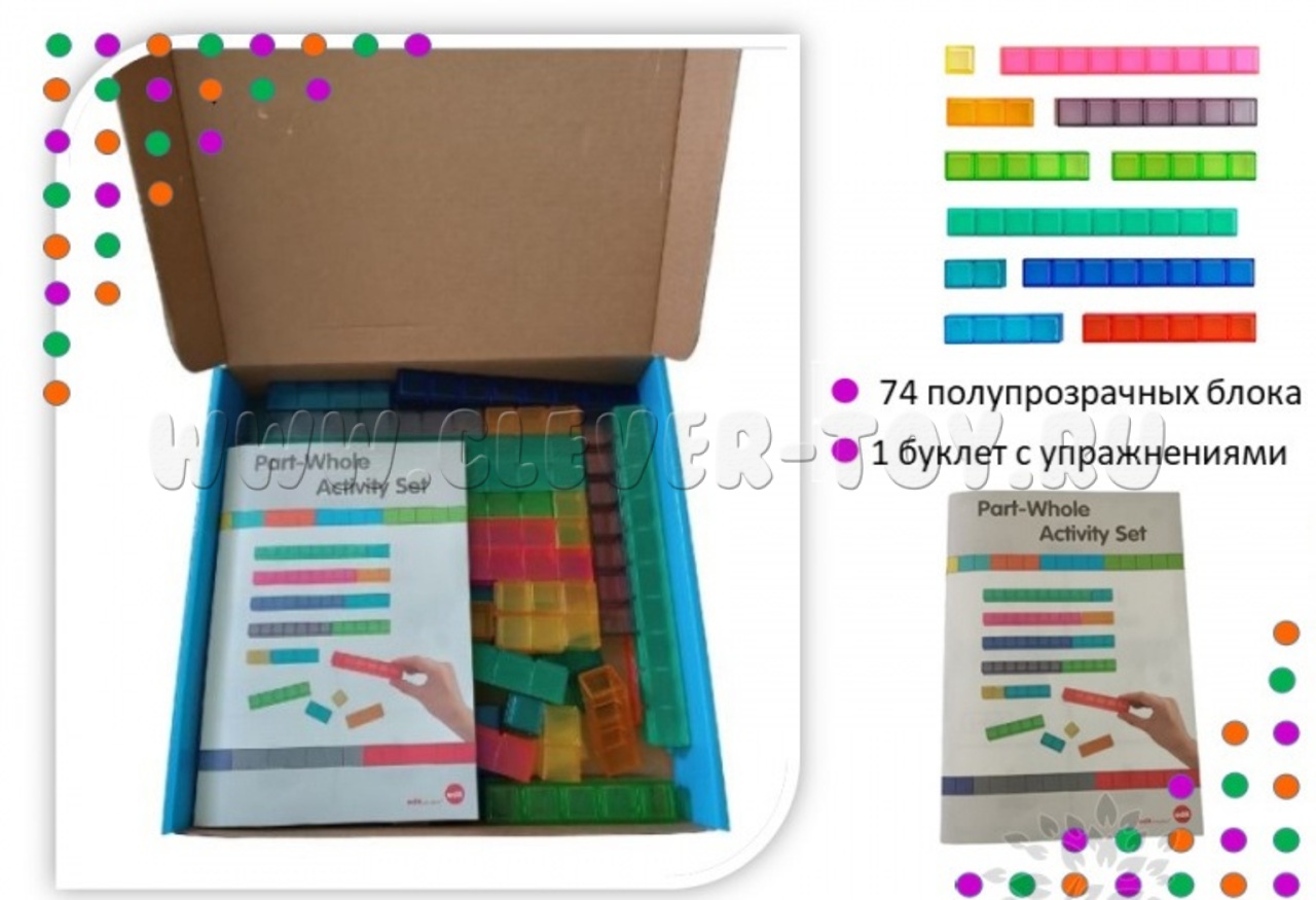 Набор подходит для изучения основ математики, понятий часть-целое, знакомит с числовыми соотношениями.