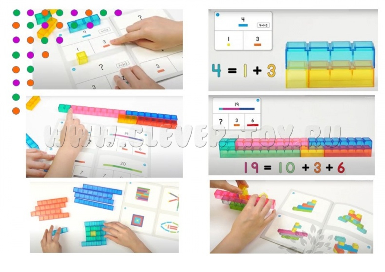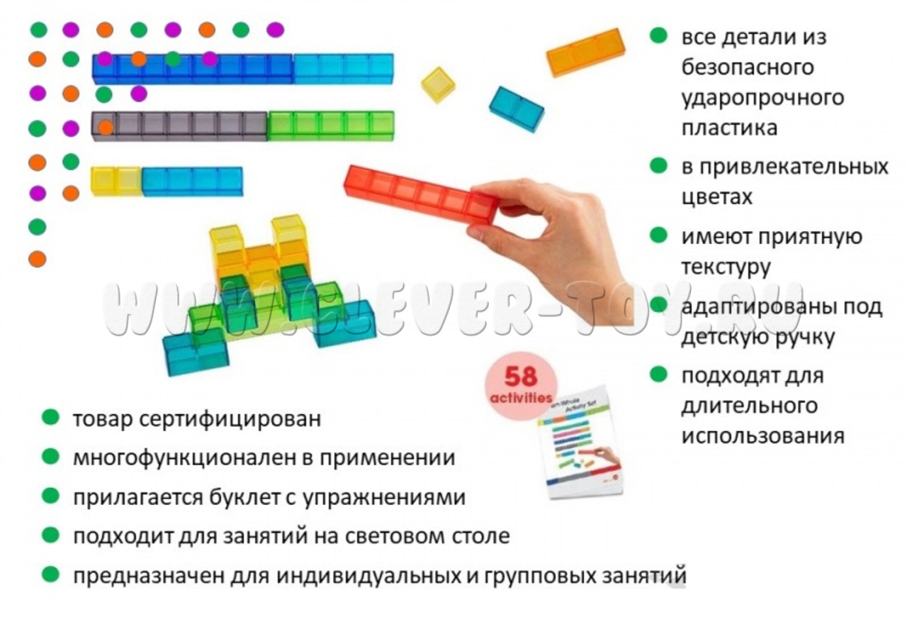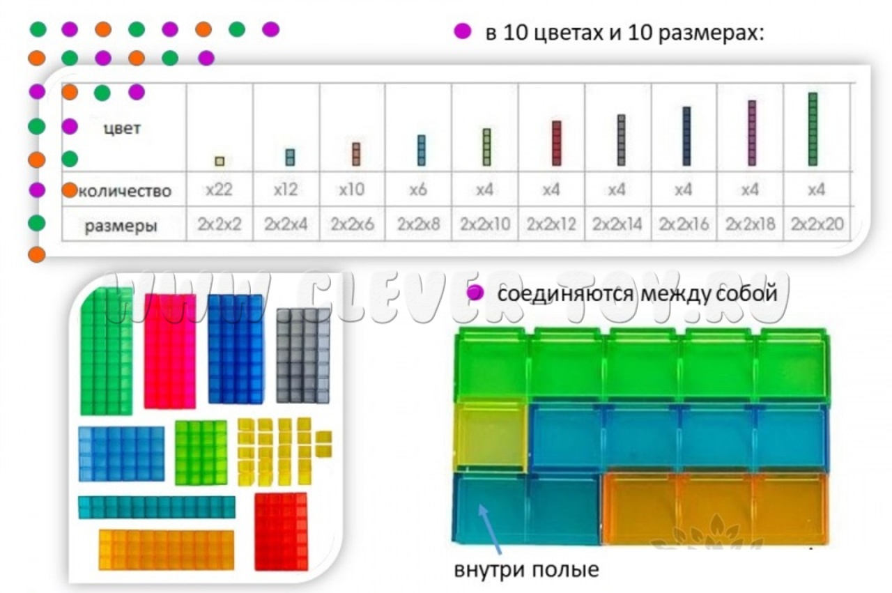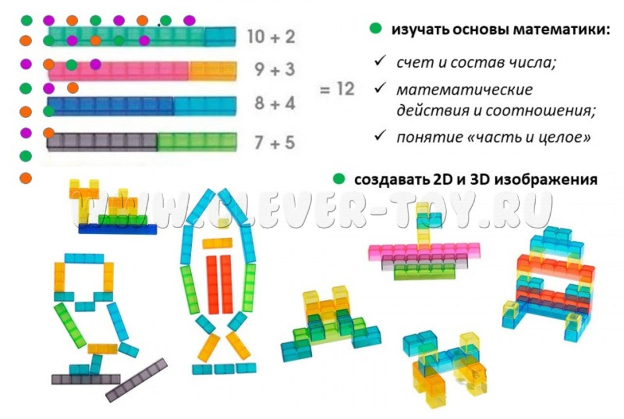 Набор подходит для изучения основ математики, понятий часть-целое, знакомит с числовыми соотношениями.