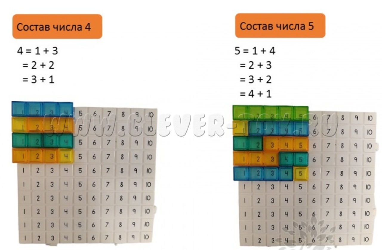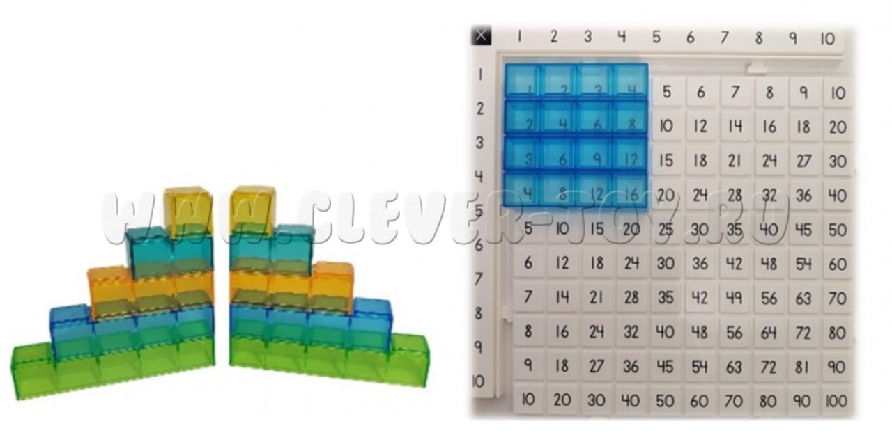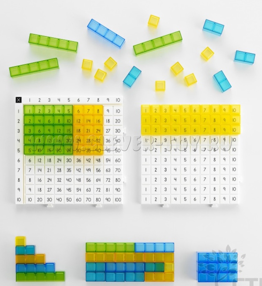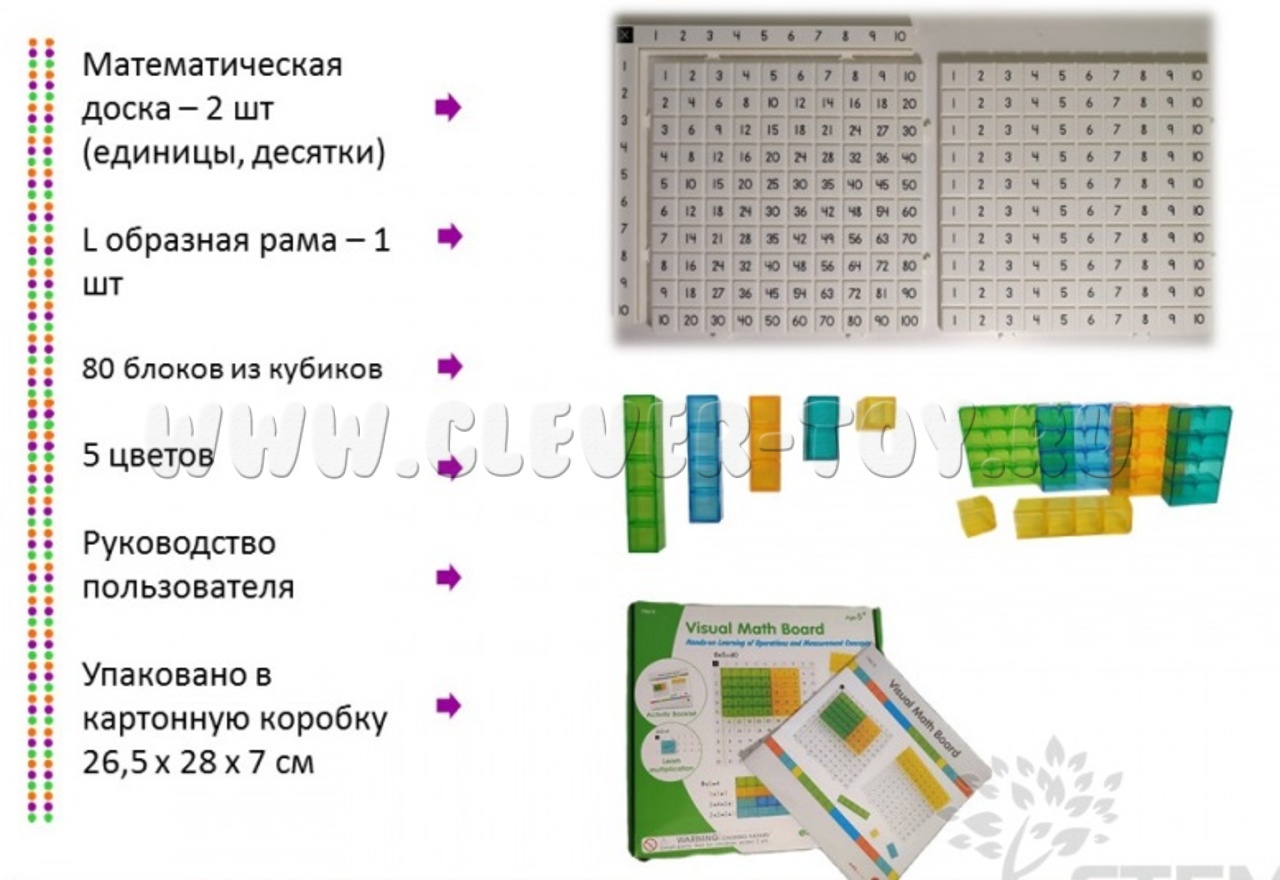 В комплект входят: 80 блоков из кубиков, 1 L-образная рама, 2 основания (математические доски), руководство.