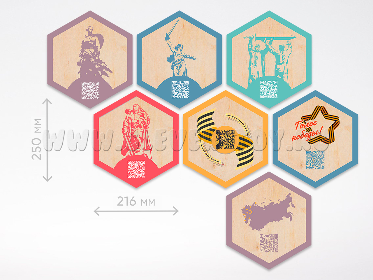 Набор "Великая Отечественная война" представляет собой комплект гексагонов различного размера, которые по-разному комбинируются между собой. Панели можно размещать в классах, холлах, коридорах, зонах отдыха учебного заведения, где они будут выполнять декоративную и обучающую функции, расширять образовательную среду.